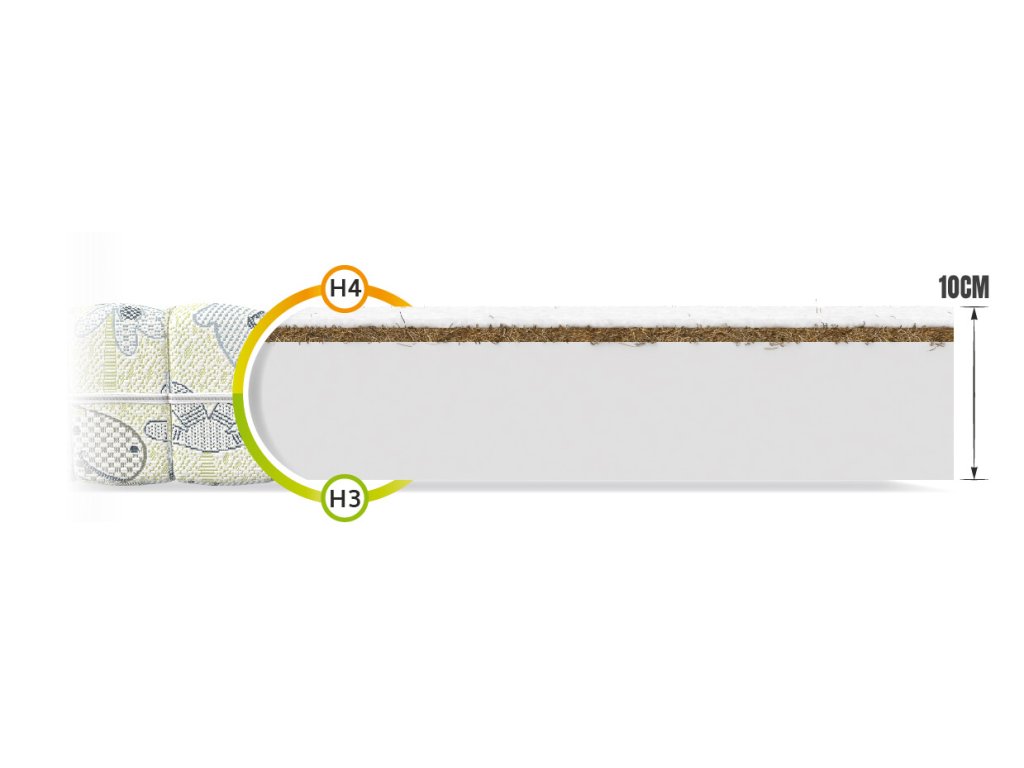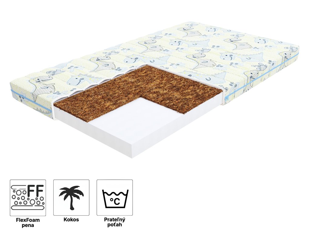 Materiálové zloženie: Prešívaný poťah, FlexFoam pena, Kokosová vrstva, Priedušná tkanina