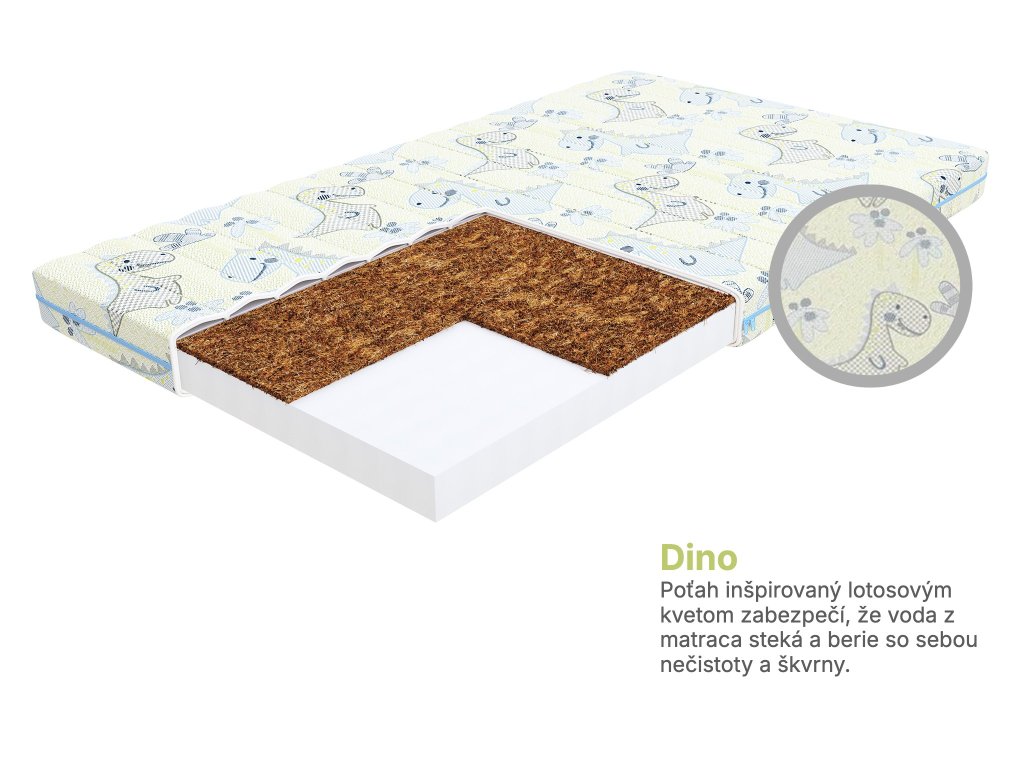 Komfortný spánok pre deti na detskom matraci Calmer 80x160. Materiály, z ktorých je vyrobený sú kvalitné a zaručia dieťatku pohodlie a komfort pri spánku.Matrac má odnímateľný poťah Dino s detským dizajnom, ktorý využíva technológiu Purotex®. Poťah Dino je z látky, ktorá je odolná voči škvrnám a inšpirovaná prírodou. Vďaka mikroskopickej štruktúre povrchu látky voda steká po matraci. Zaisťuje dobre prúdenie vzduchu a zároveň chráni matrac pred nečistotami. Matrac má polyuretánovú penu FlexFoam, ktorá je pružná a umožňuje dobrú cirkuláciu vzduchu. Pena je odolná voči trvalej deformácií a poskytuje skvelú oporu telu. Kokosová vložka je prírodná surovina získaná z kokosových škrupín. Kokosové vlákna sú odolné voči vlhkosti, deformácií a majú antialergické vlastnosti. Zlepšujú cirkuláciu vzduchu vo vnútri matraca a zabraňujú nadmernému poteniu. Priedušná tkanina je nadýchaná syntetická netkaná textília, ktorá dostatočne izoluje matrac.