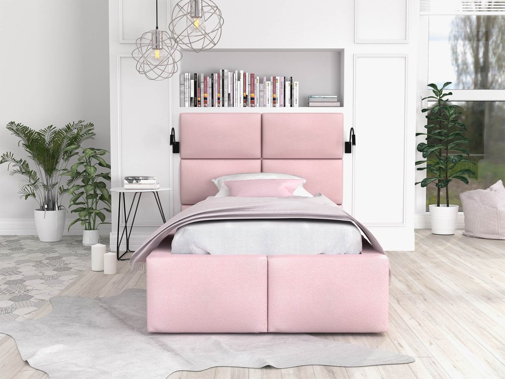 Ružová jednolôžková posteľ 90x200 DONY s vysokým čelom, výklopným lamelovým roštom a úložným priestorom je ideálna pre tých, ktorí radi čítajú knihy alebo pozerajú seriály či filmy v posteli. Posteľ je vyrobená z kvalitných a pevných materiálov, pričom celá je čalúnená príjemnou látkou Trinity, ktorá zabraňuje odreniu nôh o tvrdú hranu dosky. Vďaka výklopnému roštu (s podporou dvoch plynových piestov) a úložnému priestoru môžete mať svoje lôžkoviny neustále na dosah. Posteľ je stabilná a odolná vďaka použitým špeciálnym skrutkám s veľkým priemerom a dodatočnému výstužnému spoju.