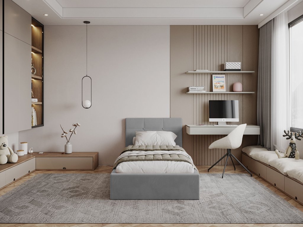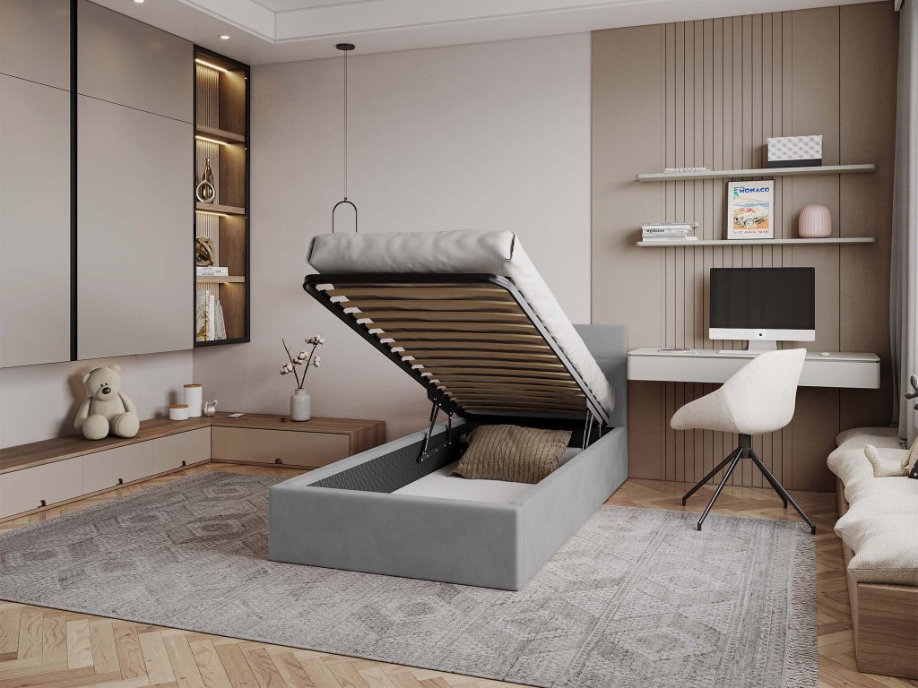 Sivá jednolôžková posteľ Ingrit 200x90 cm je čalúnená velúrom. Materiál velúr je jemný, príjemný na dotyk a odolný voči žmolkovaniu. Posteľ má kovový rám s pružnými brezovými lištami, ktoré sa prispôsobia tlaku tela. Vysoká opierka poskytuje výbornú podporu pre chrbát pri čítaní kníh. Posteľ má veľký úložný priestor po celej ploche postele. Na dvíhanie roštu v posteli, sú využívané dva plynové piesty o sile 400N až 1000N /ks, v závislosti od rozmeru postele.
