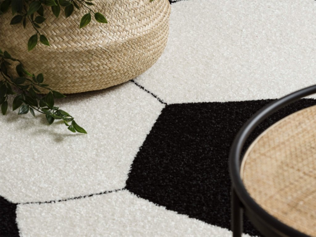 Okrúhly koberec čiernobiela Lopta je určený pre deti do detských izieb. Každý milovník futbalu sa poteší kobercu, ktorý má dizajn lopty. Výška vlasu koberca je 10 mm je vhodný aj na podlahové kúrenie. Hustota vlákna je 2000 g/m². Polypropylénové (PP) vlákna sú mäkké a pružné vďaka tepelnému spracovaniu a svojej perleťovej textúre pripomínajú ručne tkané koberce. V prípade čistenia koberca vám postačí vysávač alebo obyčajná mierne navlhčená handrička. Koberec sa vyznačuje certifikátom OEKO-TEX, to znamená, že všetky materiály sú bezpečné a nie sú zdraviu škodlivé pre vaše deti. Je k dispozícii vo viacerých rozmeroch.