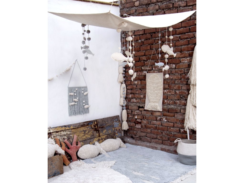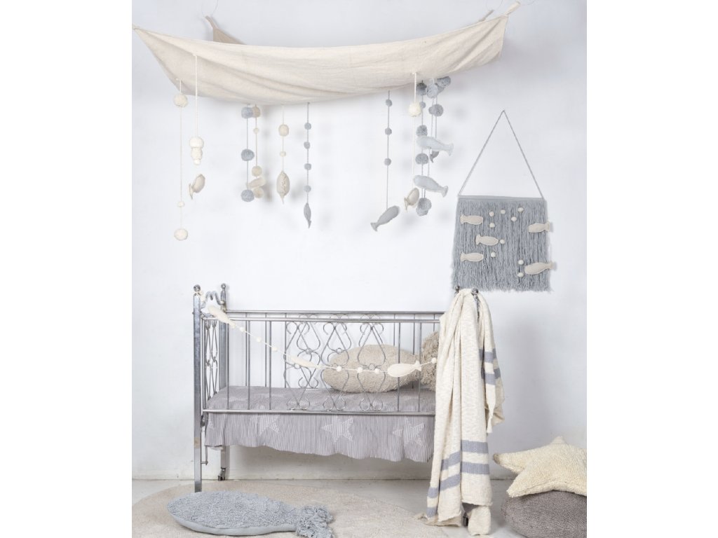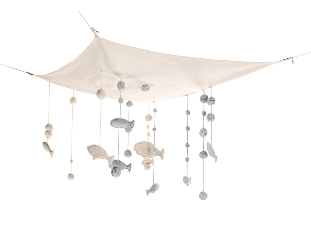 Vytvorte krásne prostredie nad detskou postieľkou alebo nad detským kútikom. Dekorácia Sea Sky sa skladá z prírodného, nezafarbeného bavlneného plátna, z ktorého visia miniatúrne vankúše v tvare rýb a bavlnené guličky pripominajúce bubliny. Vankúšiky v tvare rýb sú vyrobené zo 100% prírodnej bavlny, výplň je zo 100% polyesteru. Na každom rohu plátna je bavlnená šnúrka, vďaka ktorej ozdobu ľahšie zavesíte na strop.
