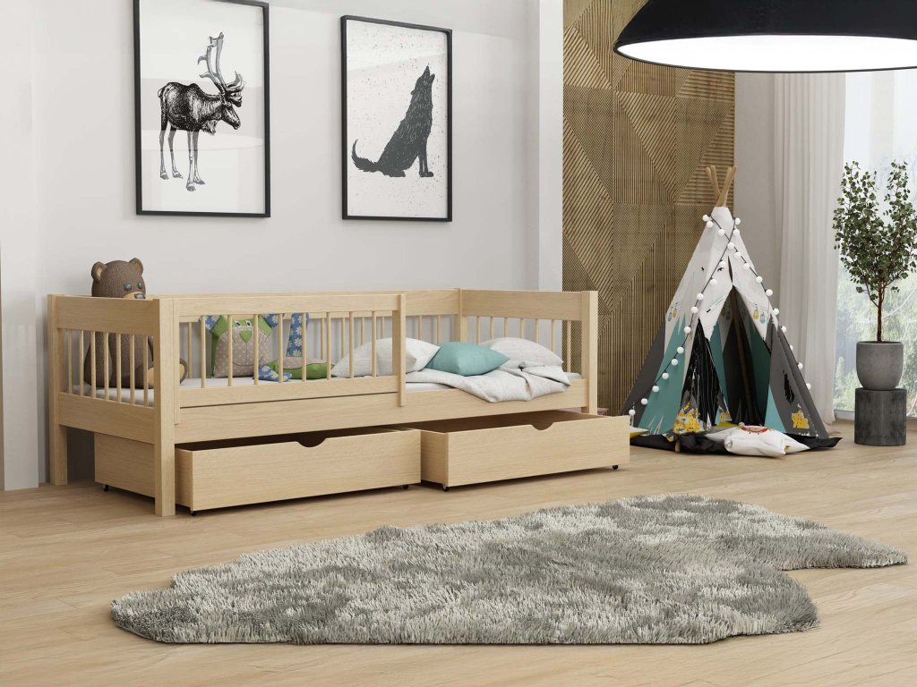 Drevená detská posteľ so zábranou Lesanka je kombináciou bezpečia, funkčnosti a nadčasového dizajnu. Vyrobená je zo 100% borovicového dreva, ktoré zaručuje pevnosť a dlhú životnosť, no zároveň pôsobí útulne a prirodzene v každej detskej izbe. Vďaka priestranným zásuvkám získate praktické miesto na uloženie posteľnej bielizne, hračiek či sezónneho oblečenia, čím udržíte v izbičke poriadok a viac priestoru na hranie. Odnímateľná bezpečnostná zábrana chráni menšie deti pred pádom, pričom jej umiestnenie si môžete prispôsobiť podľa potreby.
