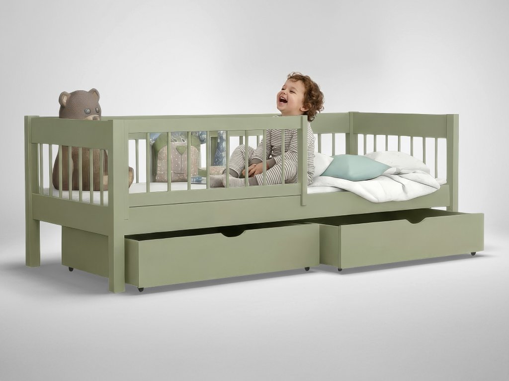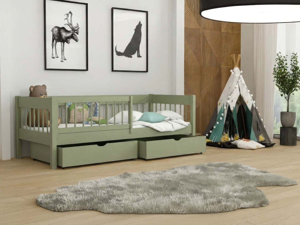 Pre zákazníkov, ktorí kladú dôraz na funkčnosť a trvácnosť, je detská posteľ 90x200 Lesanka s úložným priestorom ideálnou investíciou. Je postavená zo 100 % robustného borovicového dreva, ktoré je zárukou mimoriadnej pevnosti. Navyše, olivový odtieň dodáva posteli prírodný a upokojujúci, moderný charakter. Hlboké zásuvky, ktoré sú decentne umiestnené pod lôžkom, sa stanú vaším neoceniteľným spojencom pri usporiadaní bielizne, hračiek či oblečenia. Pomáhajú tým udržiavať izbu dokonale organizovanú a vizuálne čistú. Pre zaistenie maximálnej bezpečnosti najmenších slúži praktická odnímateľná zábrana, ktorú je možné ľahko odstrániť, akonáhle ju dieťa už nepotrebuje.