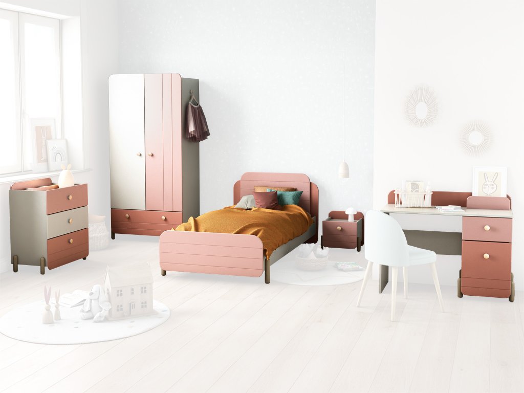 V tejto izbe nájdete všetko, čo vaše dieťa potrebuje – pohodlnú posteľ s rozmermi 90×200 cm, písací stôl s praktickým úložným priestorom, komodu so zásuvkami na oblečenie, nočný stolík a šatníkovú skriňu vybavenú policami i vešiakovou tyčou. Každý kus je navrhnutý tak, aby pomáhal udržiavať poriadok, podporoval samostatnosť a vytváral ideálne prostredie na hranie, učenie aj odpočinok.