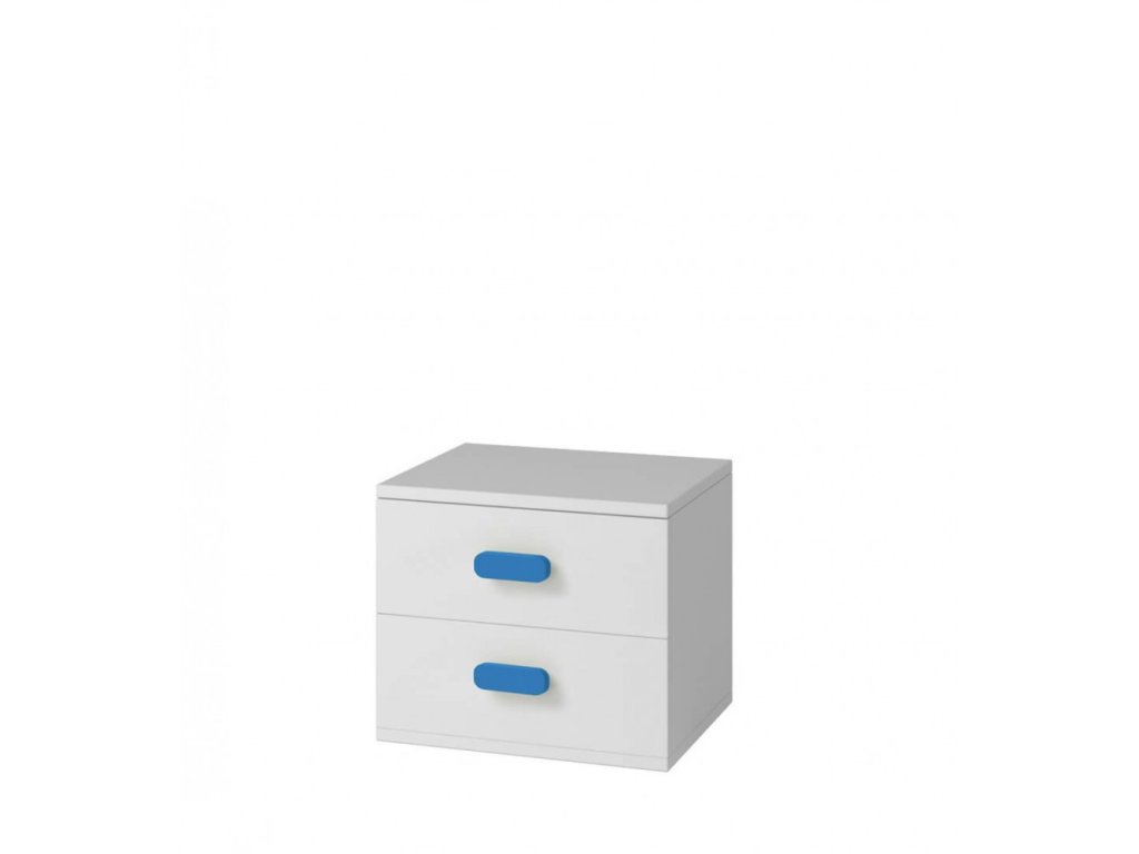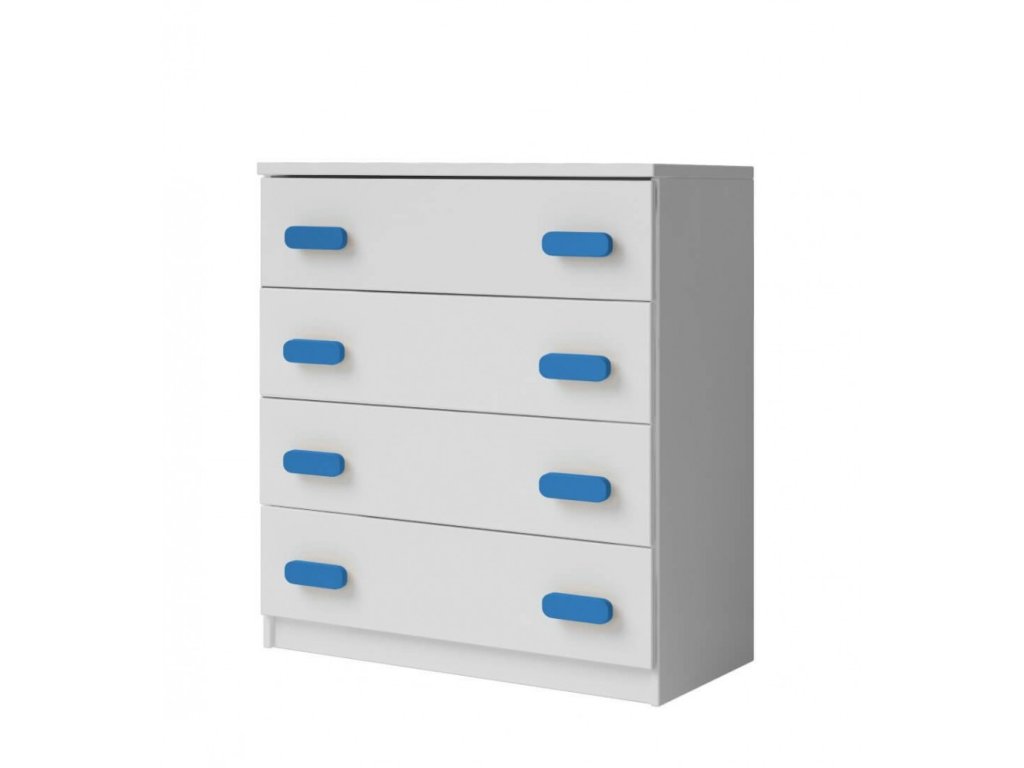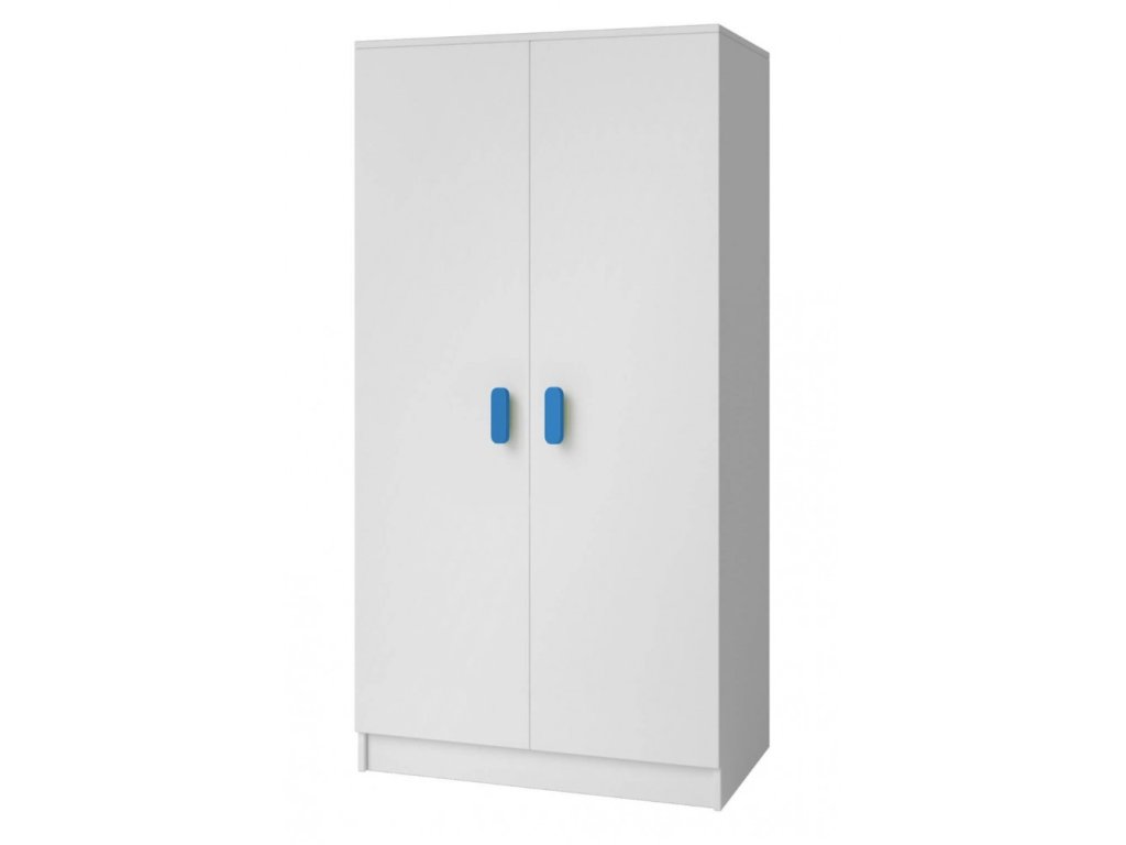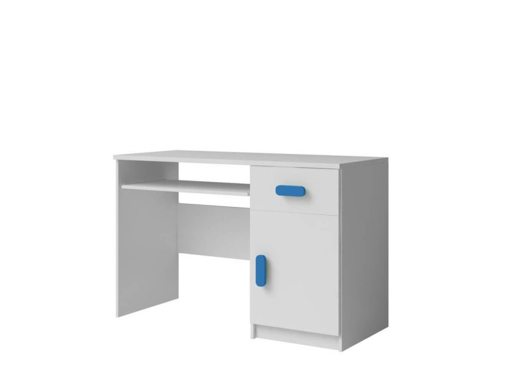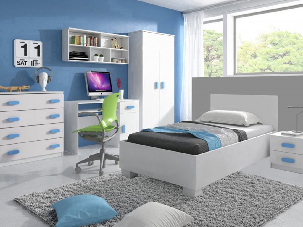Krásna a moderná detská izba Loop s jednoduchým dizajnom v bielej farbe a s modrými úchytkami. Nábytok je vyrobený z laminovaných dosiek v hrúbke 16 mm. Posteľ nie je dodávaná s matracom a roštom.
