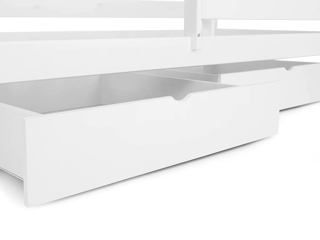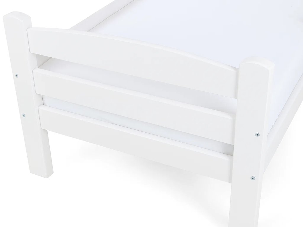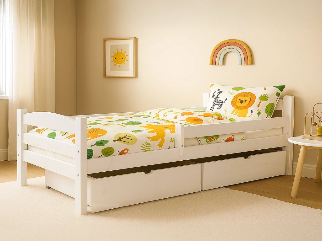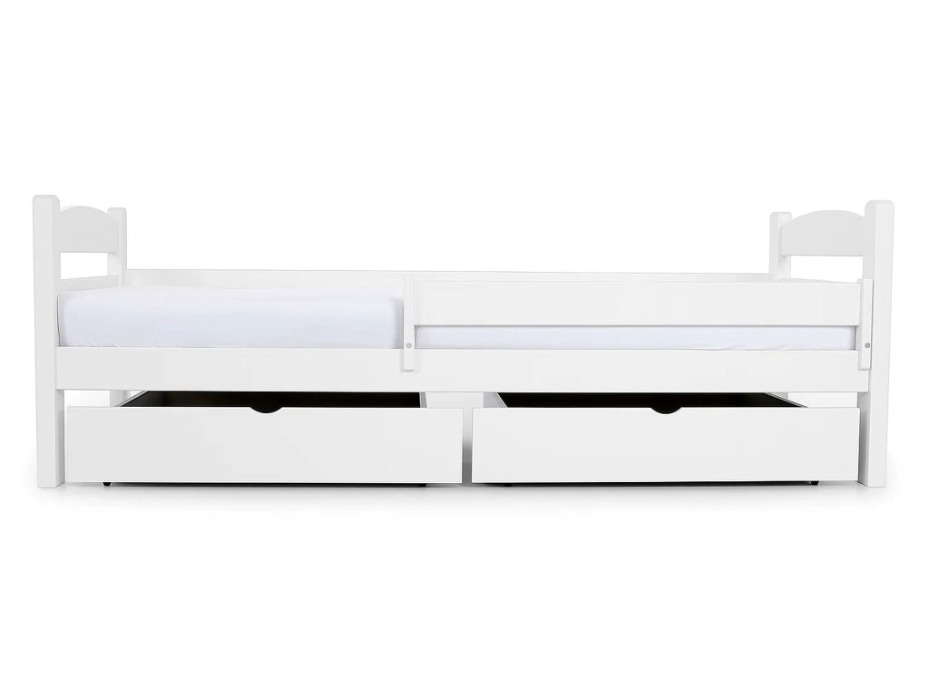 Biela masívna posteľ Oľga 5 (200x90 cm) je vyrobená z kvalitného masívneho borovicového dreva. Drevená posteľ je ošetrená bezfarebným ekologickým lakom. Vďaka použitým materiálom, ako je masív borovicového dreva a kvalitný lak je posteľ vysoko odolná a stabilná. Posteľ je dodávaná spolu s roštom a úložnými priestormi. Manipulácia s úložnými boxmi je veľmi jednoduchá, pretože nie sú nijak upevnené k posteli. Posteľ má bezpečnostnú bariéru, ktorá chráni dieťatko pred možným pádom z postele. Bariérka je odnímateľná, keď dieťatko vyrastie stačí ju jednoducho odmontovať.