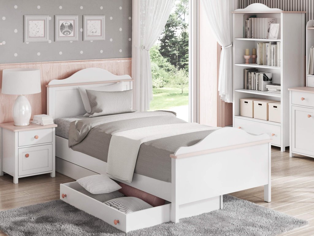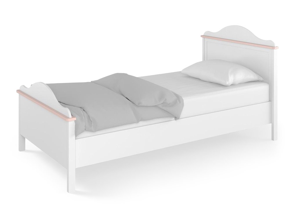 Biela detská posteľ LUNA 90x200 cm navrhnutá do dievčenskej detskej izby. Biely korpus postele je doplnený jemnými detailmi v púdrovo ružovej farbe a zaoblením v tvare vlny typickým pre túto kolekciu. Pohodlie postele zvyšuje aj vysoké čelo, o ktoré sa príjemne opiera. Konštrukcia postele je vyrobená z kvalitnej laminovanej dosky (DTD) s odolnými ABS hranami. Súčasťou postele je matrac s pružinami Bonell 90x200 cm a drevený rošt. Pokiaľ máte záujem využiť čo najlepšie aj priestor pod posteľou, môžete si k posteli prikúpiť aj jednu alebo dve úložné zásuvky pod posteľ z rovnakej kolekcie.