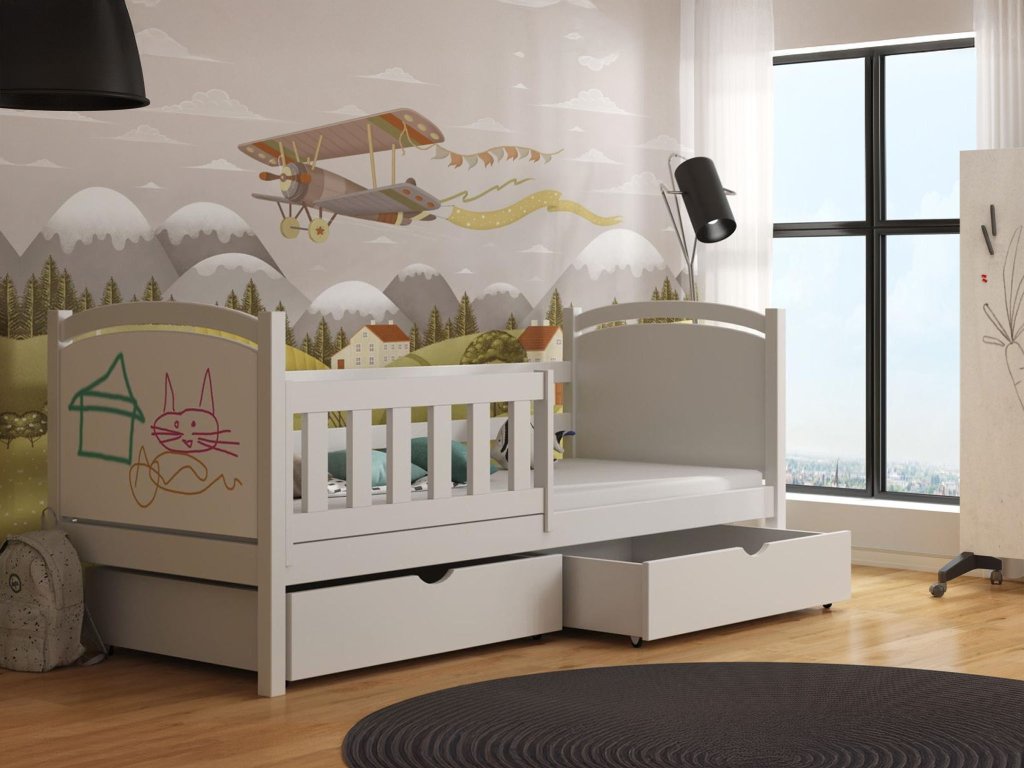 Minimalistická biela detská posteľ Neos 90x200 je dokonalým miestom pre vaše dieťa, ktoré potrebuje priestor nielen na spánok, ale aj na hranie a tvorenie. Vďaka kvalitnému borovicovému masívu ponúka pevnú a stabilnú konštrukciu, ktorá zaručuje dlhú životnosť. Zaoblené čelá dodávajú posteli elegantný vzhľad a zároveň zvyšujú bezpečnosť. Povrchová úprava zdravotne nezávadným lakom na vodnej báze je šetrná aj k alergikom, čím poskytuje maximálne bezpečné prostredie pre vaše dieťa. Neos však nie je len obyčajná posteľ – jej čelá sú vybavené nasucho stierateľnými tabuľami, ktoré podporujú kreativitu malých umelcov. Deti si môžu kresliť, písať alebo nechávať odkazy, čím sa posteľ stáva interaktívnym prvkom ich izby. O bezpečný spánok sa postará praktická zábrana, ktorá zabraňuje nechcenému pádu počas noci. Navyše, vstavaný úložný priestor poskytuje ideálne miesto na uschovanie hračiek, knižiek či posteľnej bielizne, čím pomáha udržať izbu upratanú.