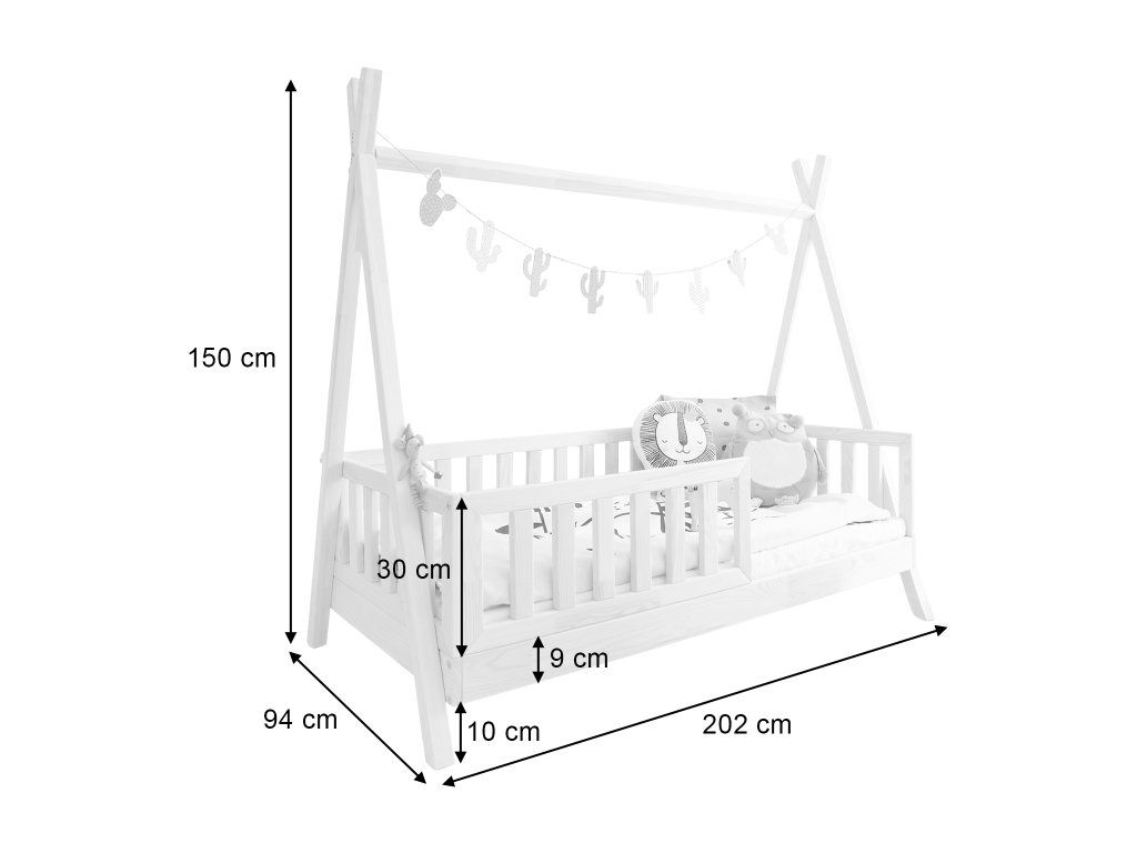 Posteľ detskej postele Tipi New I 90x190 spája praktické riešenie pre každodenný spánok s hravým vizuálom, ktorý si deti okamžite obľúbia. Táto detská posteľ vytvára príjemné a bezpečné miesto, kde môže dieťa oddychovať aj rozvíjať svoju fantáziu. Typická konštrukcia v štýle „tipi“ premieňa obyčajnú posteľ na kreatívny priestor plný možností. Pevnosť a stabilitu zabezpečuje kvalitná borovicová preglejka 1. triedy, ktorá je odolnejšia voči poškodeniu než klasický masív. Vďaka tomu si posteľ zachová svoj tvar aj pri dlhodobom používaní. Praktickým prvkom je aj ochranná zábrana, ktorá zvyšuje bezpečnosť počas spánku a minimalizuje riziko pádu.