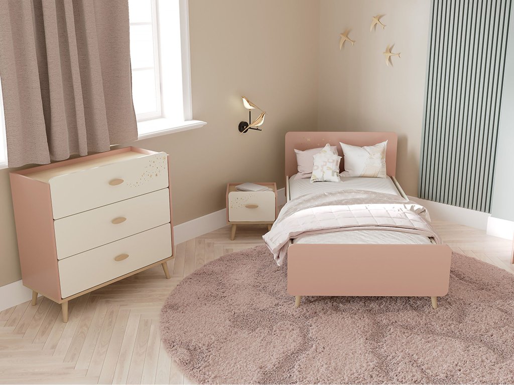Detská posteľ Suzie prináša do izby vašej dcéry nielen praktické riešenie na spánok, ale aj očarujúci rozprávkový dizajn. Jemná kombinácia ružovej a krémových detailov krásne oživí priestor a vytvorí útulnú a príjemnú atmosféru. Čelo postele zdobí nežný motív hviezdičiek, ktorý jej dodáva jedinečný a hravý vzhľad. Stabilitu a odolnosť zabezpečujú nohy z masívneho dubového dreva. Táto jednolôžková posteľ je vyrobená z kvalitných materiálov, ktoré garantujú pevnosť a pohodlie pre zdravý spánok. Povrch postele je odolný proti roztočom a alergénom, čím vytvára hygienické a bezpečné prostredie pre vaše dieťa. Rozmery pre matrac 200 × 90 cm poskytujú dostatok priestoru na pohodlný spánok počas celého detstva a jednoduchá údržba zabezpečí, že posteľ si udrží svoj krásny vzhľad dlhé roky
