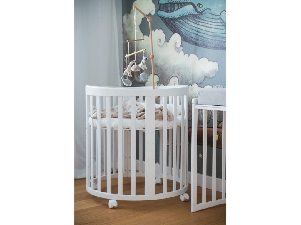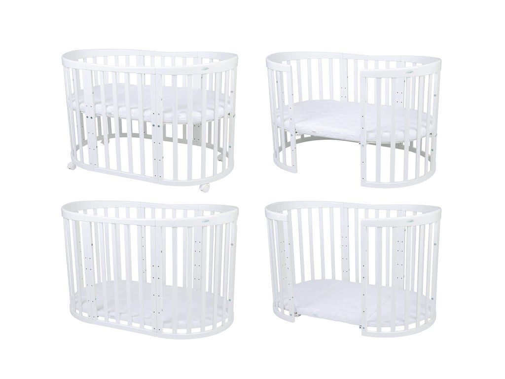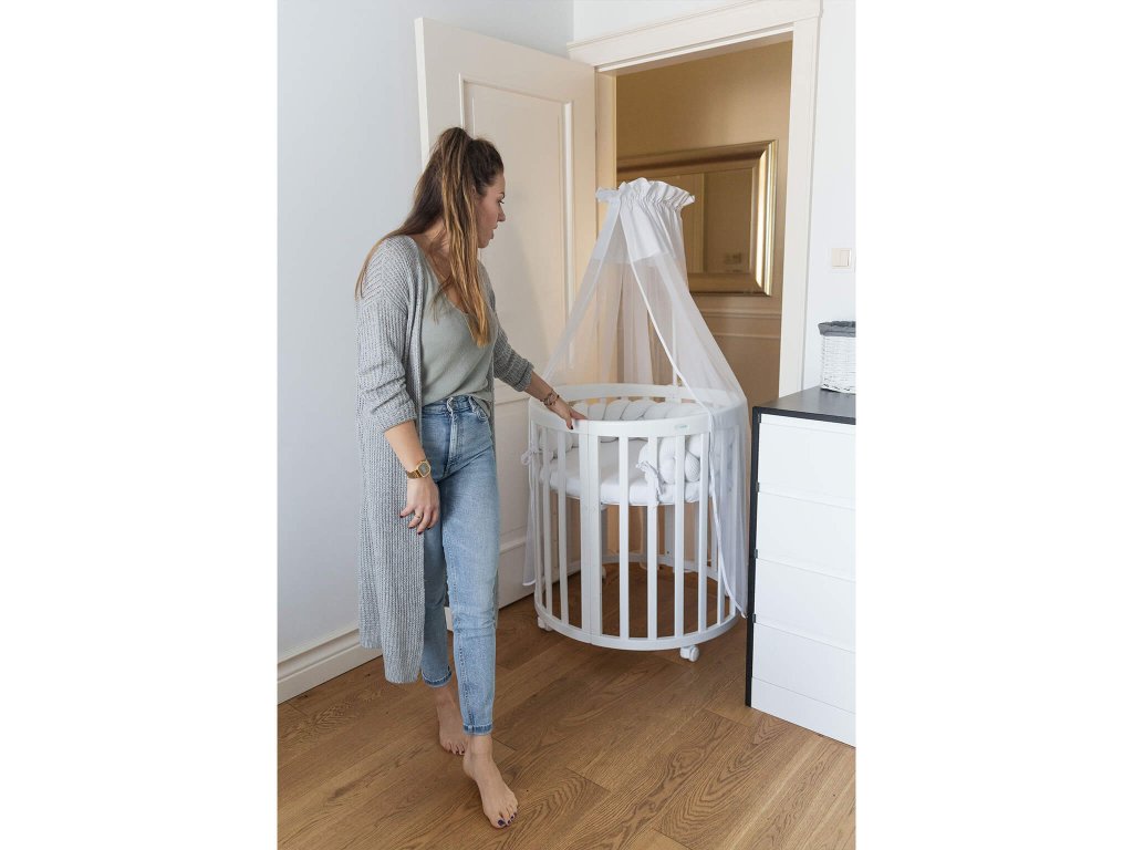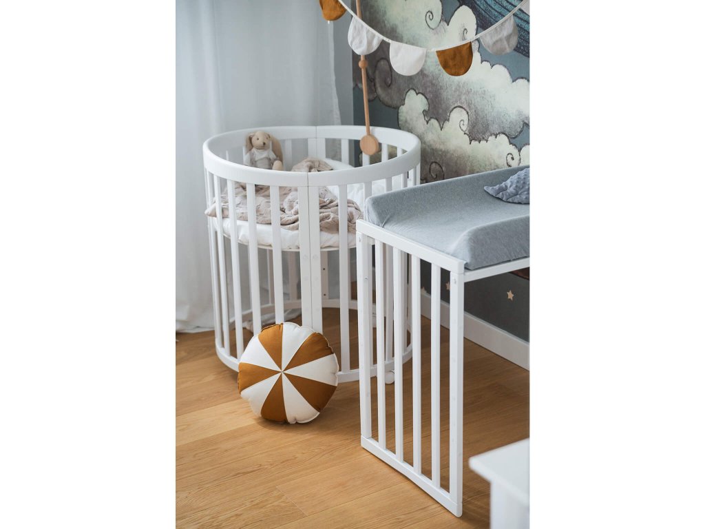 Výnimočná detská postieľka 7v1 v klasickej bielej farbe zapadne do ktorejkoľvek spálne. Rastúca postieľka má pekný okrúhly tvar, ktorý sa postupne rozšíri na ovál. Multifunkčná, okrúhla postieľka je natoľko variabilná, že ju môžete rôznymi spôsobmi využívať pre deti od 0 do 10 rokov. Záleží len na tom, ako rýchlo bude bábätko rásť. V prvých mesiacoch sa môžete rozhodnúť či si zložíte iba prístelku k manželskej posteli, alebo si rovno poskladáte malú rastúcu postieľku s prebaľovacím pultom. Okrúhla rastúca postieľka je dostupná v niekoľkých farebných prevedeniach.