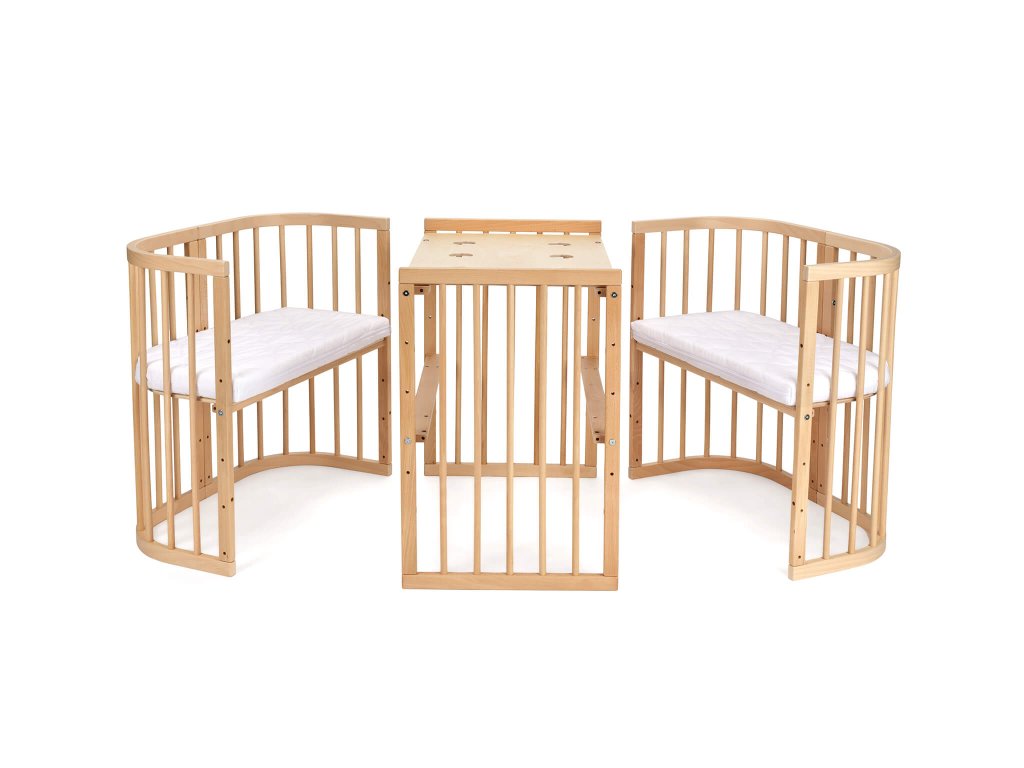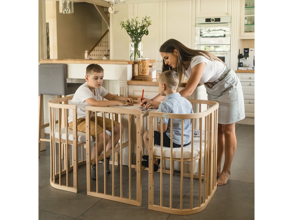 Hľadáte detskú postieľku s kolieskami, ktorú budete môcť zmysluplne využívať, aj keď z nej deti vyrastú? Rastúca postieľka 7v1 v prírodnej farbe buka je bezpečná a variabilná, takže ju môžete postupne zväčšovať, znižovať rošt a nakoniec ju rozložiť na nízky stolík s kresielkami, pri ktorom sa budú deti hrať. Spolu s postieľkou rastie aj matrac, ktorý je rozdelený na tri diely. Tie využívate podľa toho, ako máte postieľku zloženú. Rastúca postieľka je dostupná v niekoľkých farbách.