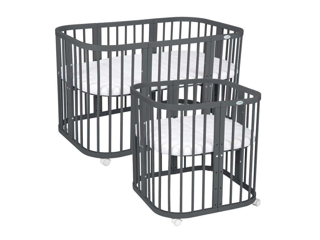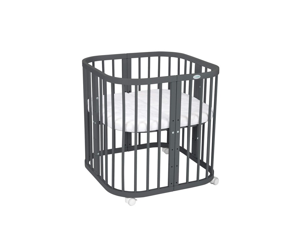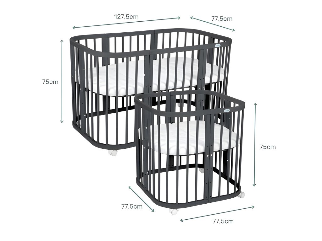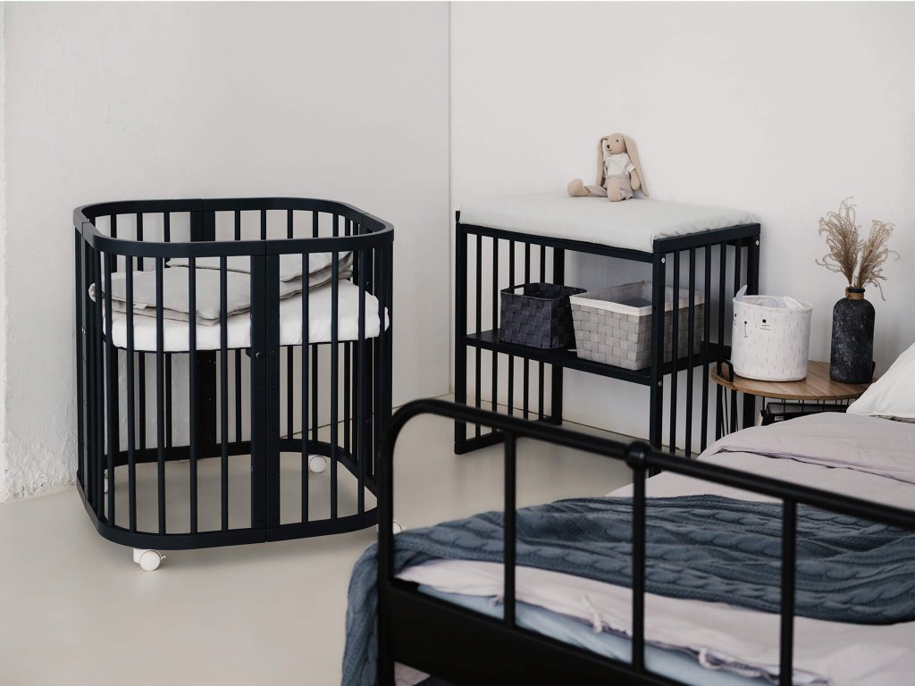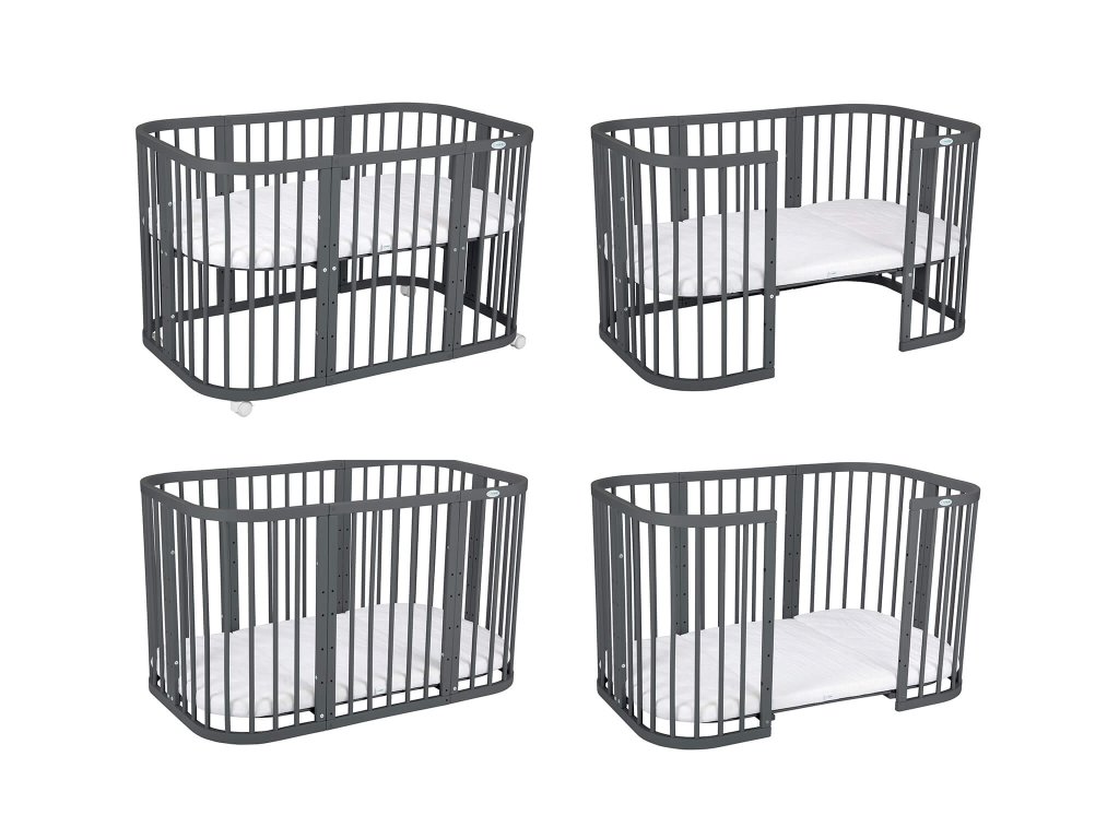 Dizajnová rastúca postieľka 7v1 vo výraznej tmavosivej farbe je bezpečná a variabilná, takže ju môžete postupne zväčšovať, znižovať rošt a nakoniec ju rozložiť na stolík s kresielkami, pri ktorom sa budú deti hrať. S postieľkou rastie aj matrac, ktorý je rozdelený na tri časti. Tie využívate podľa toho, ako máte postieľku zloženú. Rastúca postieľka je dostupná v niekoľkých farbách. Do 6 mesiacov dieťatka môžete využívať prístelku, ktorú si pripevníte o manželskú posteľ alebo postieľku na kolieskach s prebaľovacím pultom. Kolieska majú bezpečnostnú brzdu. Keď postieľku odbrzdíte, viete ju jednoducho presúvať si ju po byte.