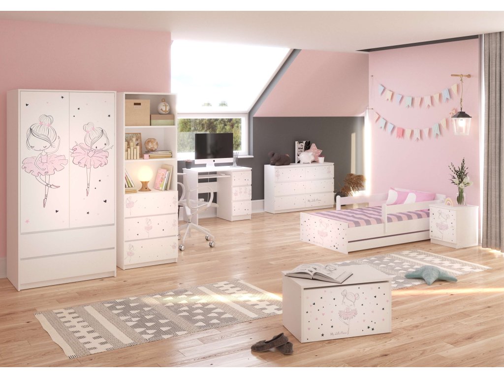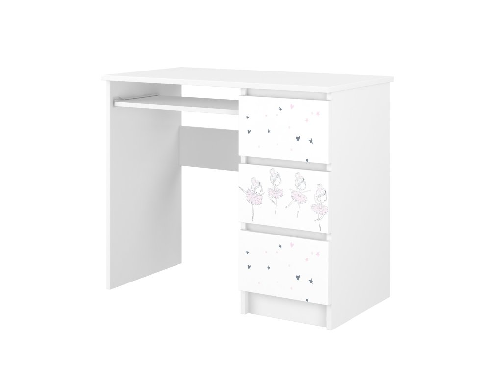 Detský písací stôl Ballerina je vyrobený z kvalitnej laminovanej dosky (DTD). Vďaka použitým prírodným materiálom je 100% ekologický, bezpečný a zdravotne nezávadný. Dievčenský písací stôl má na zásuvkách farebnú potlač, ktorá je zabezpečená špeciálnym laminátom. Môžete ho jednoducho vyčistiť saponátom. Pasuje k ostatnému nábytku z kolekcie Ballerina, ktorá Vám umožní vytvoriť detskú izbu tak, aby vyhovovala veľkosti miestnosti a potrebám dieťaťa.