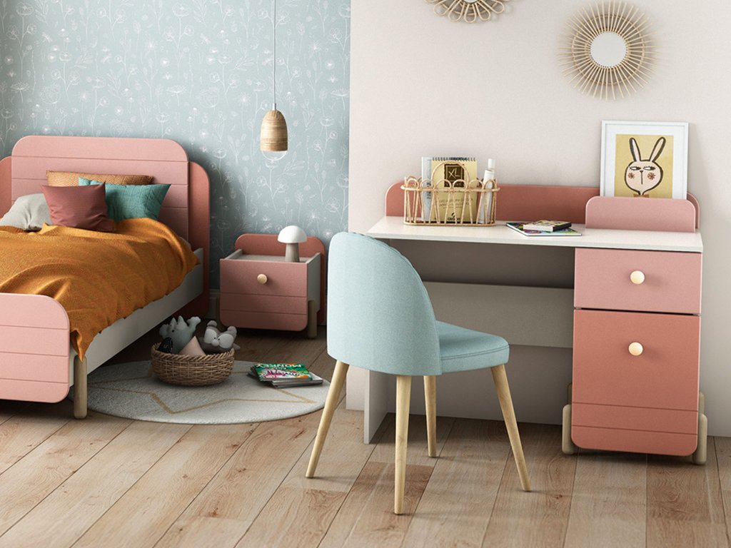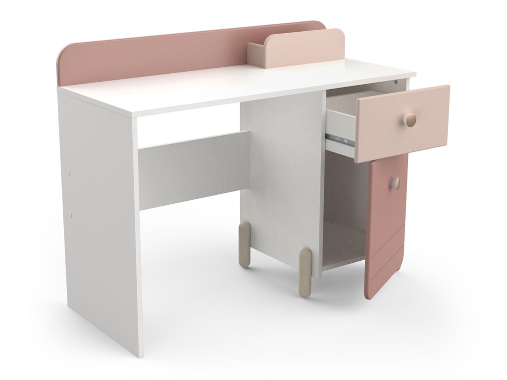 Písací stôl Jade kombinuje praktickosť, bezpečný dizajn a jemnú eleganciu, ktorá ho robí ideálnym pracovným miestom pre každú školáčku. Vyrobený je z odolnej drevotriesky a lakovaného MDF v matnej ružovo-bielej kombinácii, pričom zaoblené tvary a úchyty v odtieni ružového zlata dodávajú štýlový a zároveň bezpečný vzhľad.