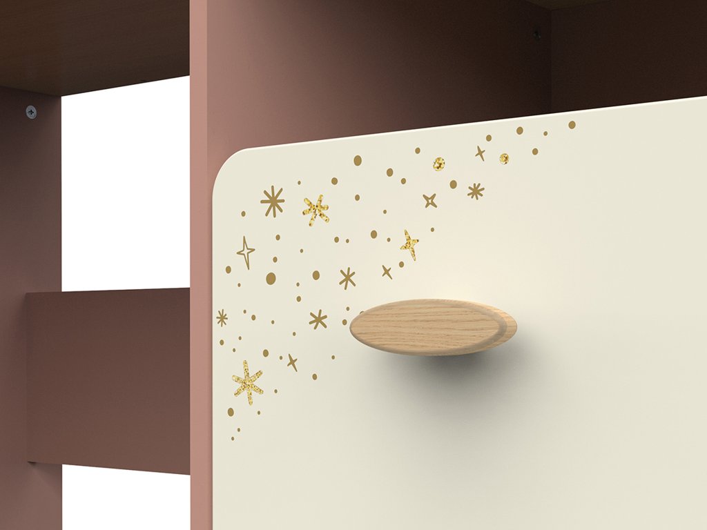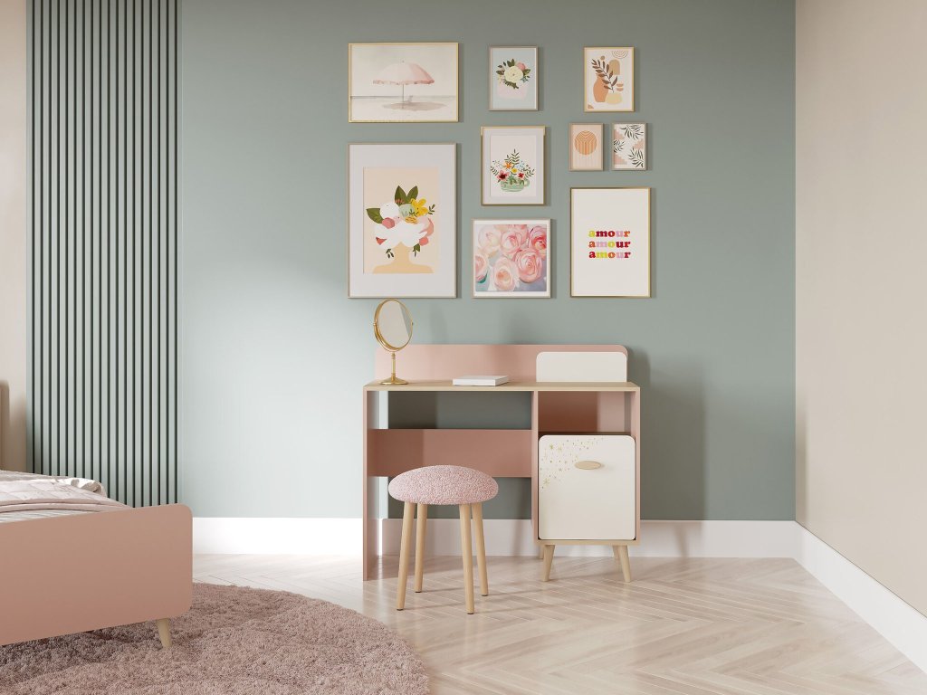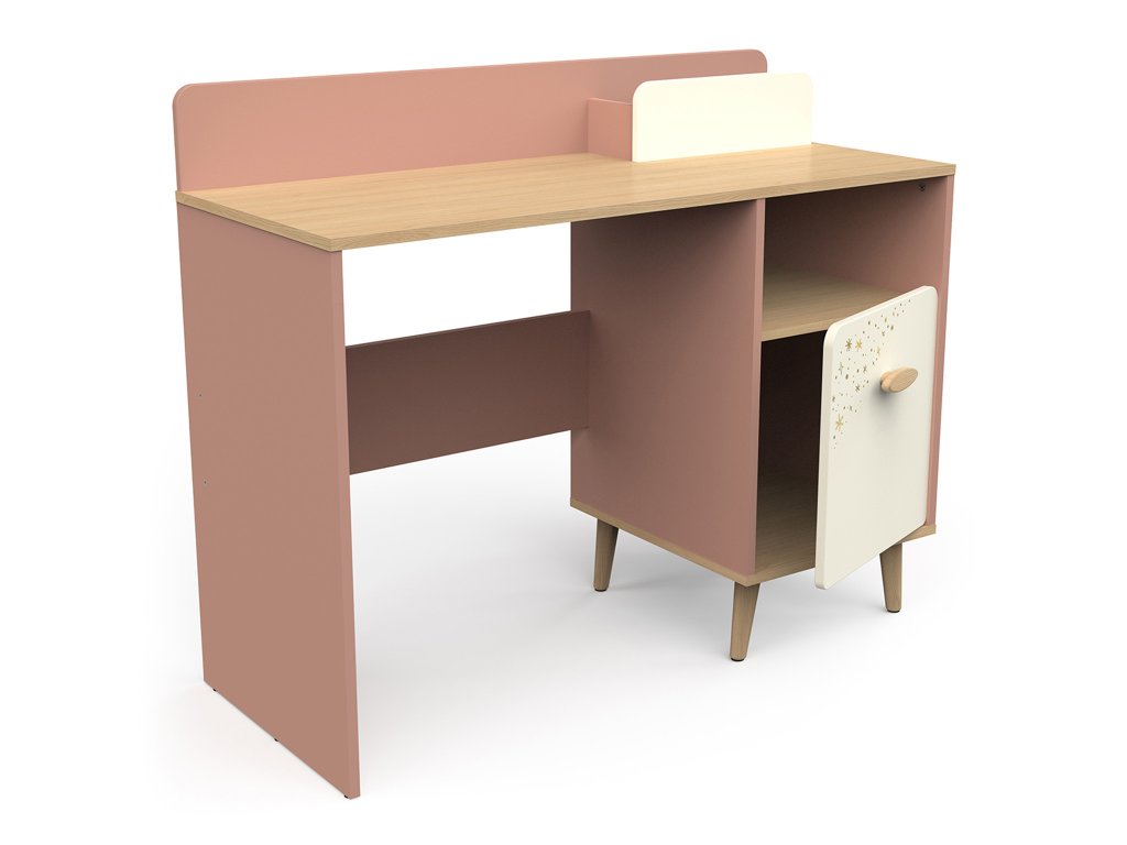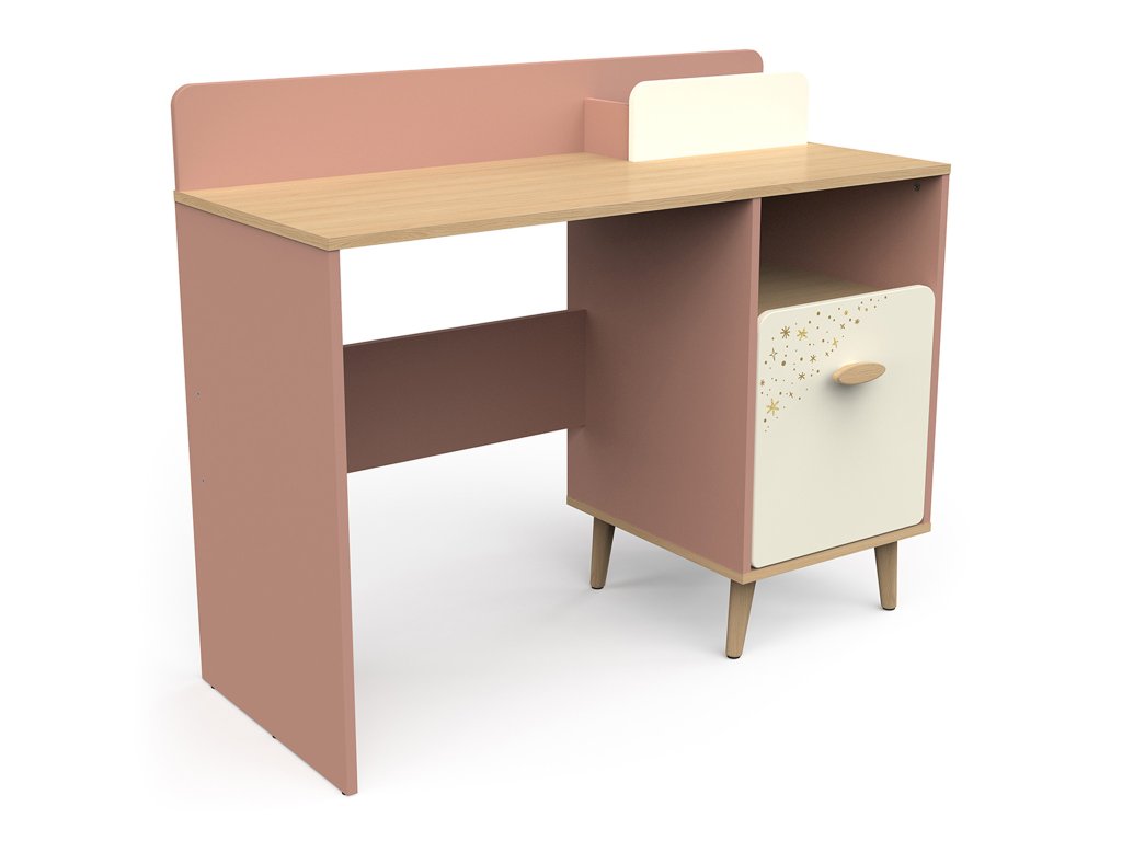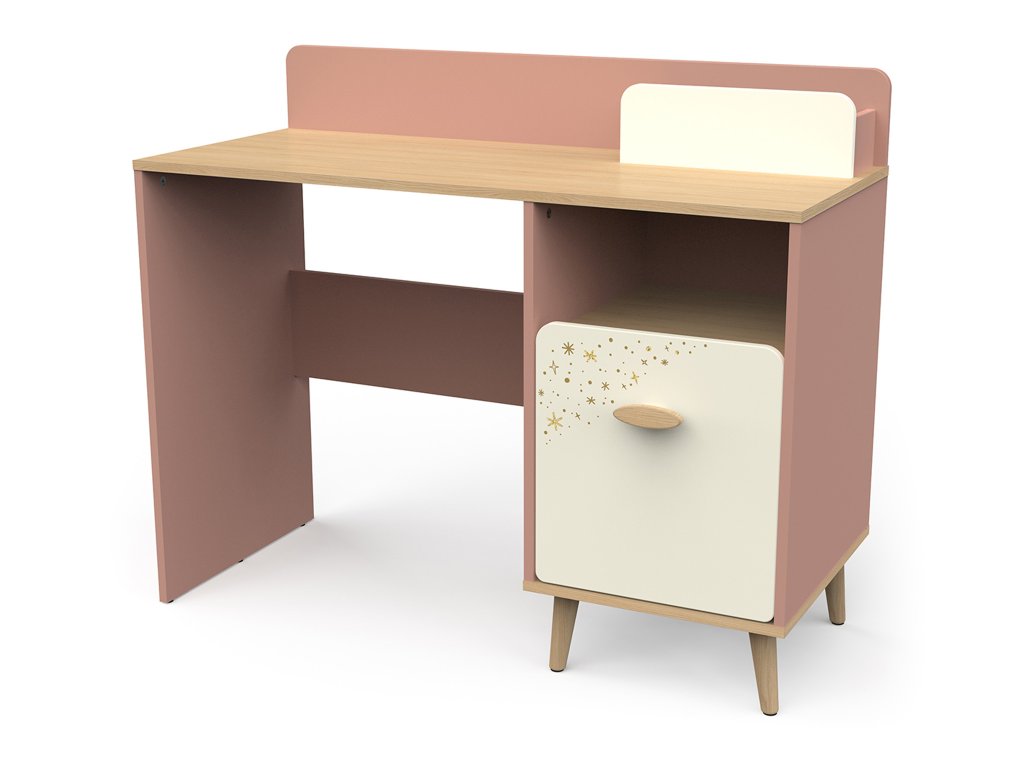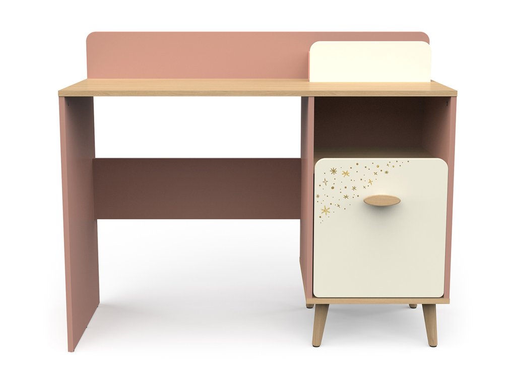 Písací stolík Suzie si rýchlo získa srdce každej malej školáčky. Jeho nežná kombinácia ružovej a krémovej farby vnesie do izby radosť a príjemnú atmosféru. Stabilitu a dlhú životnosť mu zabezpečujú kvalitná konštrukcia a pevné nožičky z masívneho dubu. Predné dvierka zdobí rozkošný motív hviezdičiek, ktorý mu dodáva rozprávkový vzhľad. Stolík ponúka praktický úložný priestor za dvierkami na knihy či školské potreby a tiež otvorenú poličku, kam si dieťa môže odložiť ceruzky alebo drobnosti, ktoré potrebuje mať vždy po ruke. Priestranná horná plocha poskytuje dostatok miesta na učenie, písanie, kreslenie aj prácu s počítačom. Písací stolík Suzie tak vytvorí útulné a inšpiratívne miesto na každodenné úlohy aj kreatívne aktivity