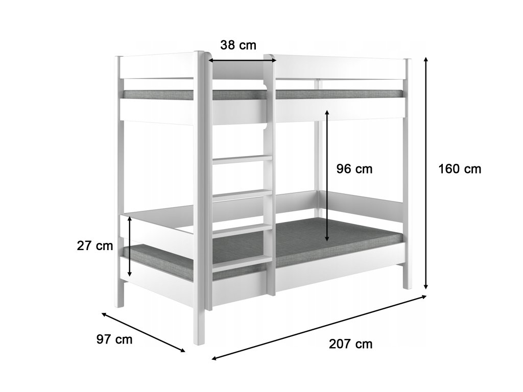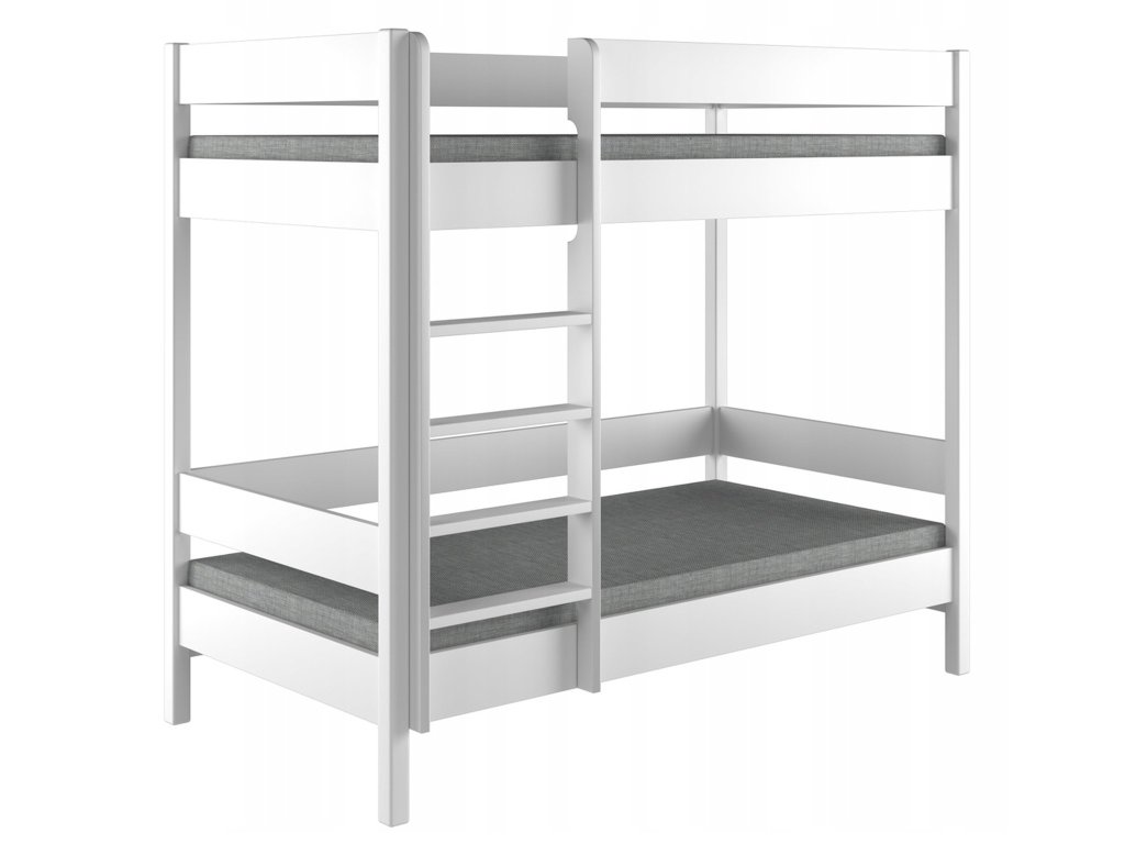 Biela poschodová posteľ Diego s dvoma lôžkami je vyrobená z borovicového masívu a z pevnej konštrukcie. Diego patrí medzi poschodové postele s nosnosťou 150 kg. Rebrík na posteli je obojstranný, tzn. že ho môžte namontovať na pravú alebo na ľavú stranu. K posteli je možné zakúpiť úložné boxy vo farbe postele. Súčasťou postele je rebrík a latový rošt.