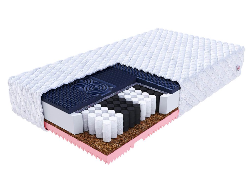 Materiálové zloženie: Polyuretánová pena s hustotou 25 kg/m3, Taštičkové pružiny, masážna studená HR pena, pamäťová pena Visco s hustotou 40 kg/m3, kokos, poťah