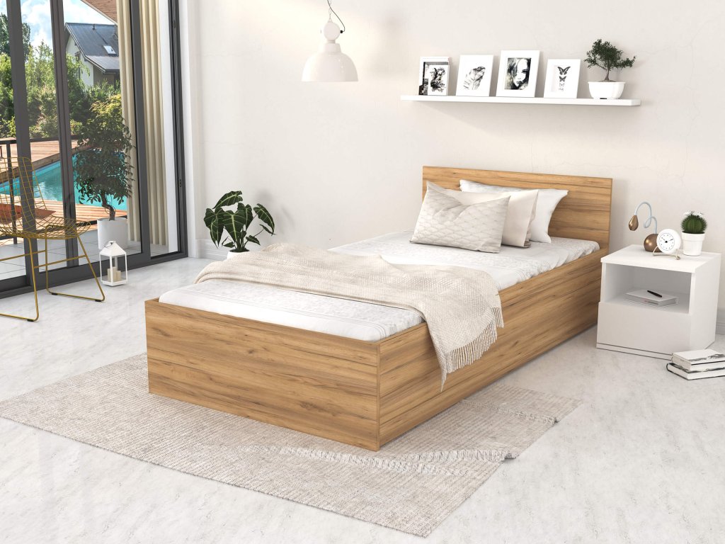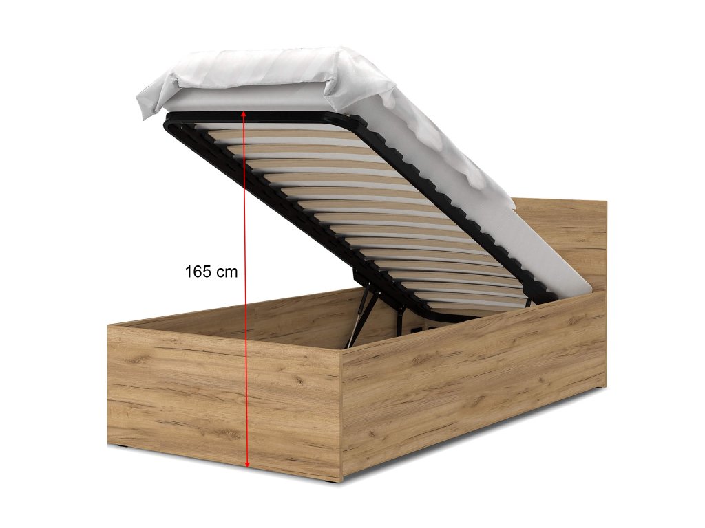 Praktická jednolôžková posteľ vo farbe dub craft Dolly, Vám zaimponuje priestranným úložným priestorom, ktorý využijete na posteľnú bielizeň či iné potrebné veci v detskej izbe. Jej jednoduchý vzhľad sa hodí do každého interiéru, ako pre chlapca tak i pre dievča.Konštrukcia postele je vyrobená z kvalitnej nábytkovej dosky DTD o hrúbke 16-18 mm, ktorá je odolná a ľahko sa čistí. Súčasťou postele je kvalitný kovový rošt s drevenými lamelami. Na dvíhanie roštu v posteli, sú využívané dva plynové piesty o sile 400N až 1000N /ks, v závislosti od rozmeru postele.
