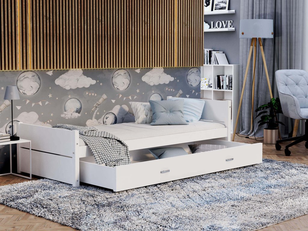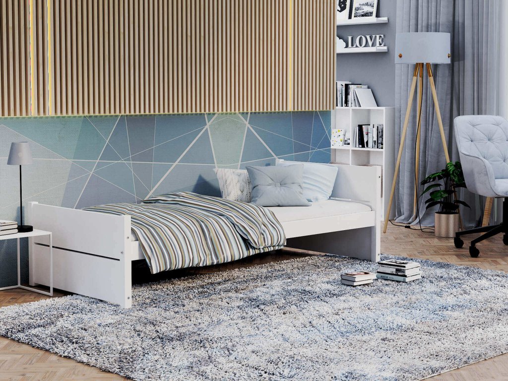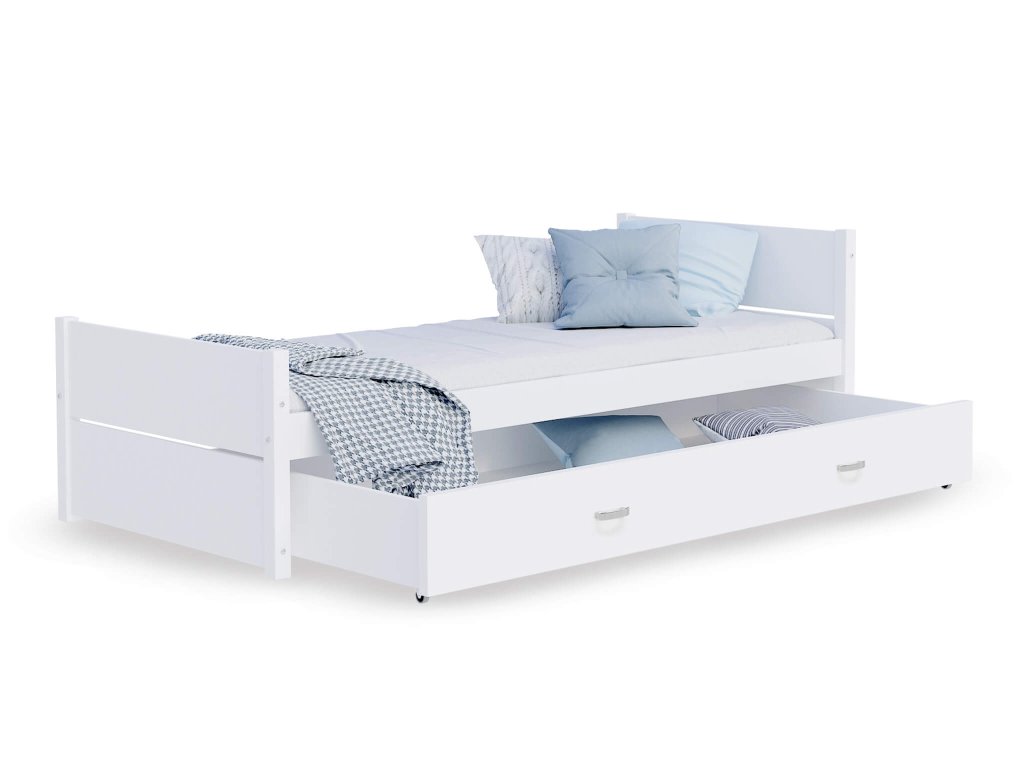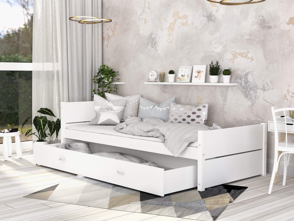Biela posteľ 90x200 s úložným priestotom a roštom pre deti či tínedžerov DANTE je spojením odolnosti a zaujímavého dizajnu. Každá hračka, deka, sezónne oblečenie či posteľná bielizeň si nájde miesto v úložnom boxe na kolieskach. Na výrobu postele boli použité kvalitné a odolné materiály. Vďaka spojeniu postele kladivovými skrutkami je posteľ pevná a stabilná. Vďaka jej štýlovému vzhľadu ju môžete použiť v akokoľvek zariadených interiéroch detskej, študentskej či hosťovskej izby. Posteľ Dante poskytuje maximálne pohodlie počas spánku vďaka svojmu flexibilnému lamelovému roštu z odolného masívneho dreva, nakoľko zvyšuje pružnosť a komfort matraca. Posteľ je ošetrená lakom na vodnej báze, ktorý je bez zápachu a je bezpečný pre detské výrobky.
