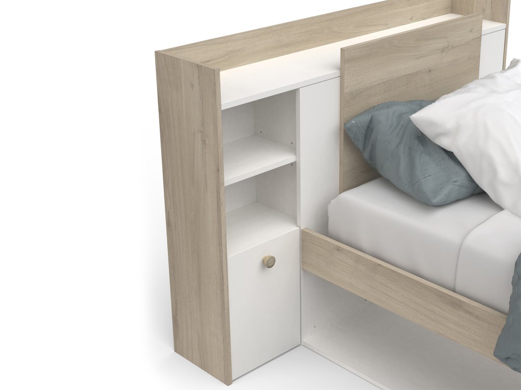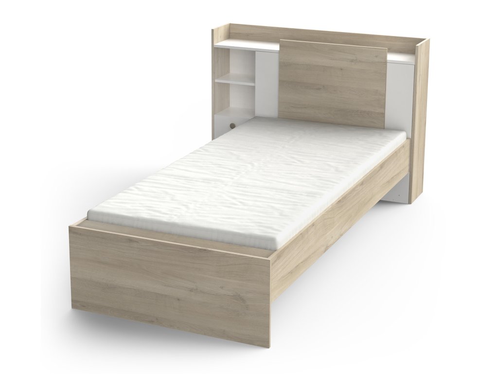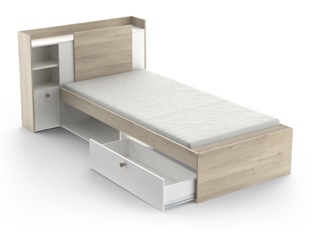 Posteľ Stora v nežnej kombinácii bielej a svetlého dubu je ideálnou voľbou do detskej či študentskej izby, kde ponúka funkčnosť aj vkusný dizajn. Vďaka svojim kompaktným rozmerom a premyslenému úložnému priestoru je ideálna aj do menších interiérov. Posteľ zaujme moderným, čistým dizajnom a zároveň ponúka všetko potrebné – pohodlné lôžko, priestranný šuplík pod posteľou aj funkčný nadstavec s policami na knihy či dekorácie. Posteľ disponuje vyberateľnou vnútornou doskou, ktorá pri použití skracuje lôžko na 190 cm, no po jej vybratí je možné vložiť matrac s rozmerom 90 × 200 cm.
