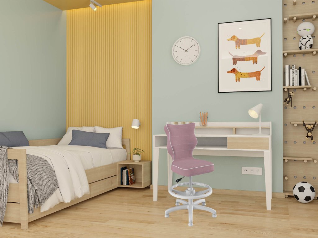 Detské obdobie prináša nielen radostné momenty na hrade alebo v záhrade, ale aj čas venovaný učeniu a splneniu povinností. Aby sa deti mohli správne učiť a písať, je dôležité, aby mali svoje pohodlné miesto. S detskou ergonomickou stoličkou Petit to dosiahnete bez námahy. Je to ideálna voľba, pretože je navrhnutá s ohľadom na ergonómiu a tvarovaná tak, aby podporovala správne postavenie panvy, čo je kľúčové pre zachovanie zdravej chrbtice. Ružová farba látky Jasmine je odolná voči opotrebeniu a vydrží až 100 000 cyklov. Vaše deti budú mať pohodlné sedenie a oporu počas svojich aktivít. Tento typ detských stoličiek bol vyvinutý v spolupráci s odborníkmi z oblasti ortopédie, ergonómie a biomechaniky. Základná časť stoličky Petit je vyrobená z plastu a sklolaminátu. Stoličku je ľahké nastaviť výškovo vďaka plynovému zdviháku z pevnej ocele. Konštrukcia zahŕňa päťhviezdičkový podstavec vyrobený z plastu. Súčasťou stoličky je aj pevná biela podnožka.
