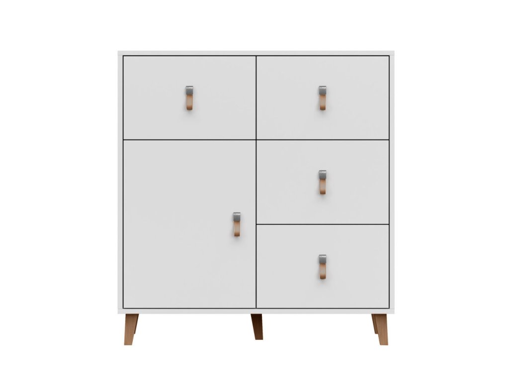 Dizajnová komoda disponuje dostatkom odkladacieho priestoru v podobe zásuviek a jednej skrinky.