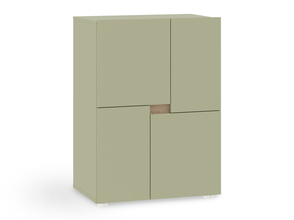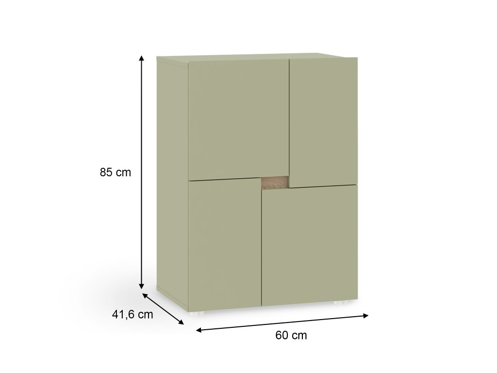Komoda Lens v zelenom odtieni sa skvele hodí do akéhokoľvek interiéru a jednoducho sa prispôsobí rôznym štýlom zariadenia. Je vyrobená z kvalitnej 16 mm laminovanej drevotriesky, ktorá zaručuje dlhú životnosť, odolnosť voči poškodeniu a jednoduchú údržbu. Všetky viditeľné hrany sú opatrené odolnou ABS hranou, pričom zadná strana je bez hrany. Komoda disponuje štyrmi dvierkami so štandardnými pántami a praktickým bezúchytkovým systémom otvárania. Dvierka sa otvárajú jednoducho uchopením cez otvor medzi čelami, čo eliminuje potrebu klasických úchytiek a dodáva nábytku moderný vzhľad. Vnútorný priestor obsahuje jednu priestrannú policu, ktorá poskytuje dostatok miesta na prehľadné uloženie vecí. Stabilitu komody zabezpečujú okrúhle plastové nožičky v striebornom prevedení.