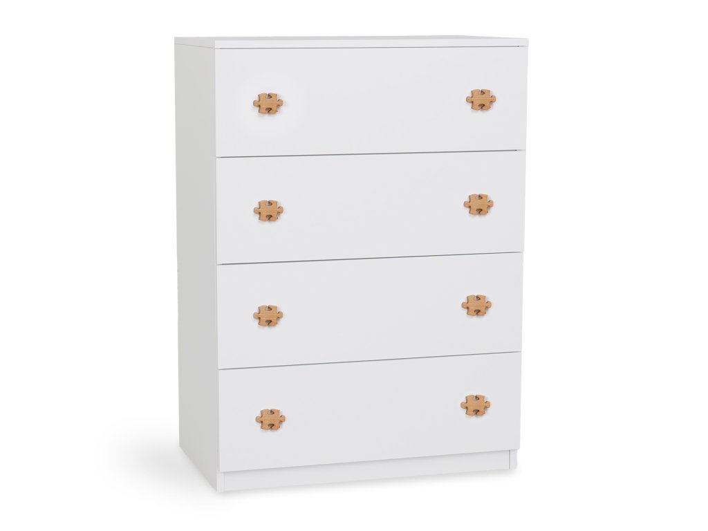 Rozjasnite detskú izbu štýlovou komodou Leo L4 v bielej farbe, ktorá kombinuje moderný dizajn s hravými prvkami. Táto komoda je ideálnou voľbou pre rodičov, ktorí hľadajú funkčný a zároveň estetický nábytok do detskej izby. Úchytky v tvare puzzle dodávajú komode hravý a originálny vzhľad, ktorý si obľúbia deti aj dospelí. Komoda Leo L4 je vyrobená z kvalitnej drevotriesky KRONO, čo zaručuje jej pevnosť a dlhodobú odolnosť. Hrany sú ošetrené PVC páskou HRANIPEX, ktorá chráni komodu pred nárazmi a zvyšuje jej životnosť. Vďaka štyrom priestranným zásuvkám ponúka komoda dostatok miesta na uloženie hračiek, oblečenia alebo školských potrieb. Úchytky v tvare puzzle nielen zaujmú svojím dizajnom, ale tiež podnietia detskú kreativitu a fantáziu. Pre tých, ktorí chcú komodu prispôsobiť podľa vlastného vkusu, sú k dispozícii aj ďalšie farebné varianty úchytiek. Komoda Leo L4 je perfektným doplnkom do detskej izby, ktorý nielen skvele vyzerá, ale zároveň podporuje organizáciu a udržiavanie poriadku. Vytvorte svojim deťom priestor, kde sa budú cítiť pohodlne a šťastne!