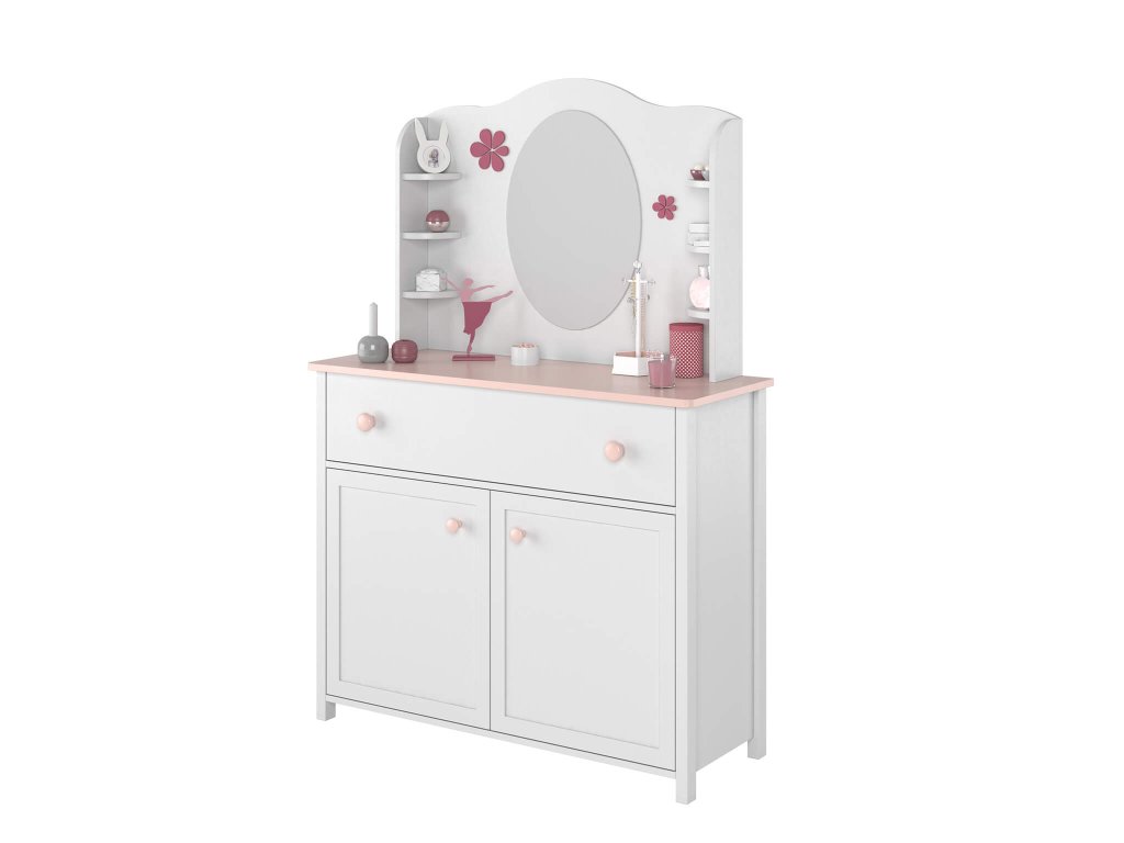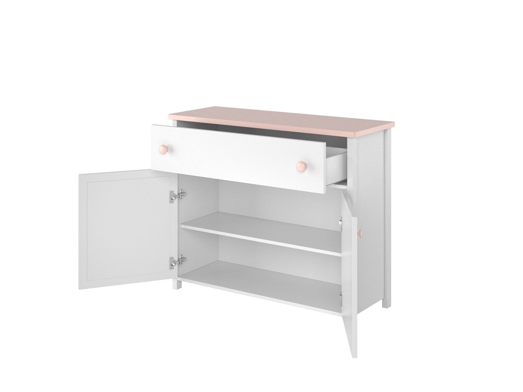 Nízka biela komoda z kolekcie nábytku LUNA navrhnutého do detskej izby. Korpus komody v bielej farbe je doplnený úchytkami a vrchnou doskou v púdrovo ružovej. Táto farebná kombinácia pôsobí veľmi jemne a dievčensky. V hornej časti komody je umiestnená priestranná zásuvka a pod ňou skrinka s dvomi dvierkami a policami. Navyše na komodu si môžete dokúpiť aj nadstavec v štýle toaletného stolíka s veľkým oválnym zrkadlom. Nábytok je vyrobený z kvalitnej laminovanej dosky s hrúbkou 16 mm. Hrany sú zakončené ABS dyhou. Úchytky sú vyrobené z plastu.