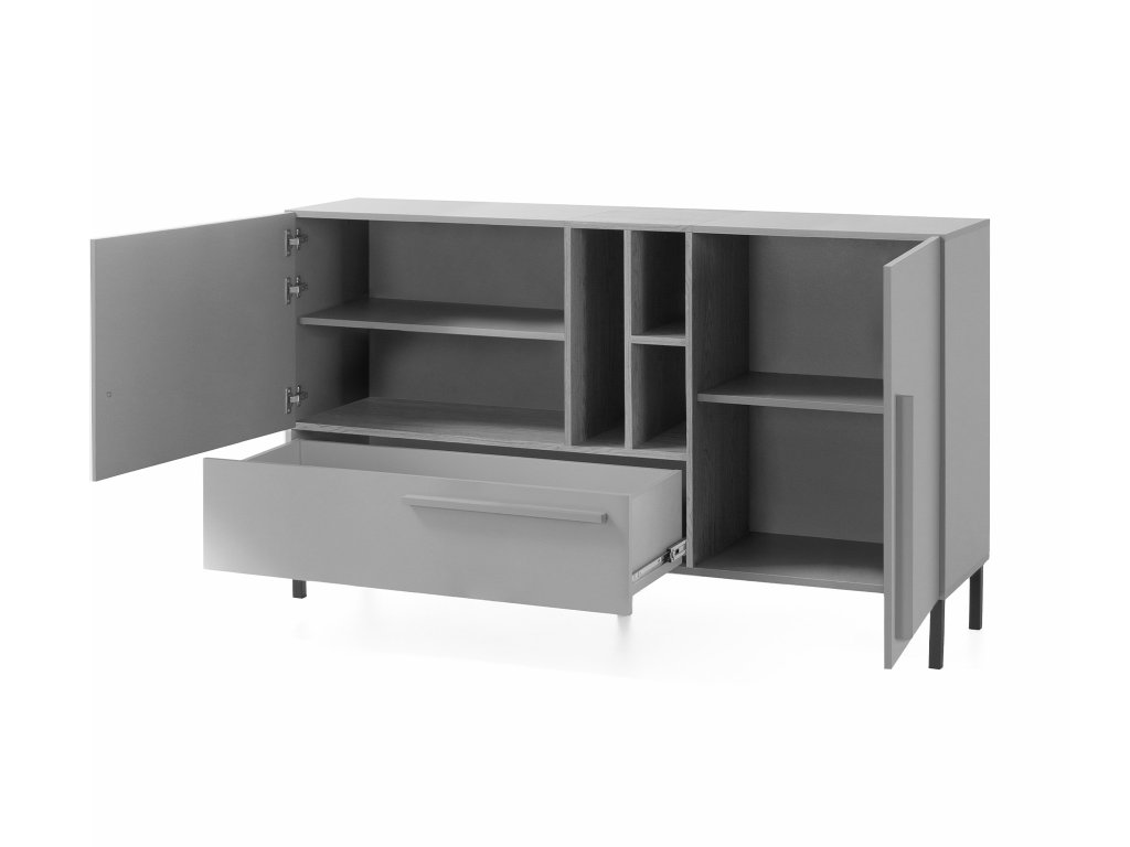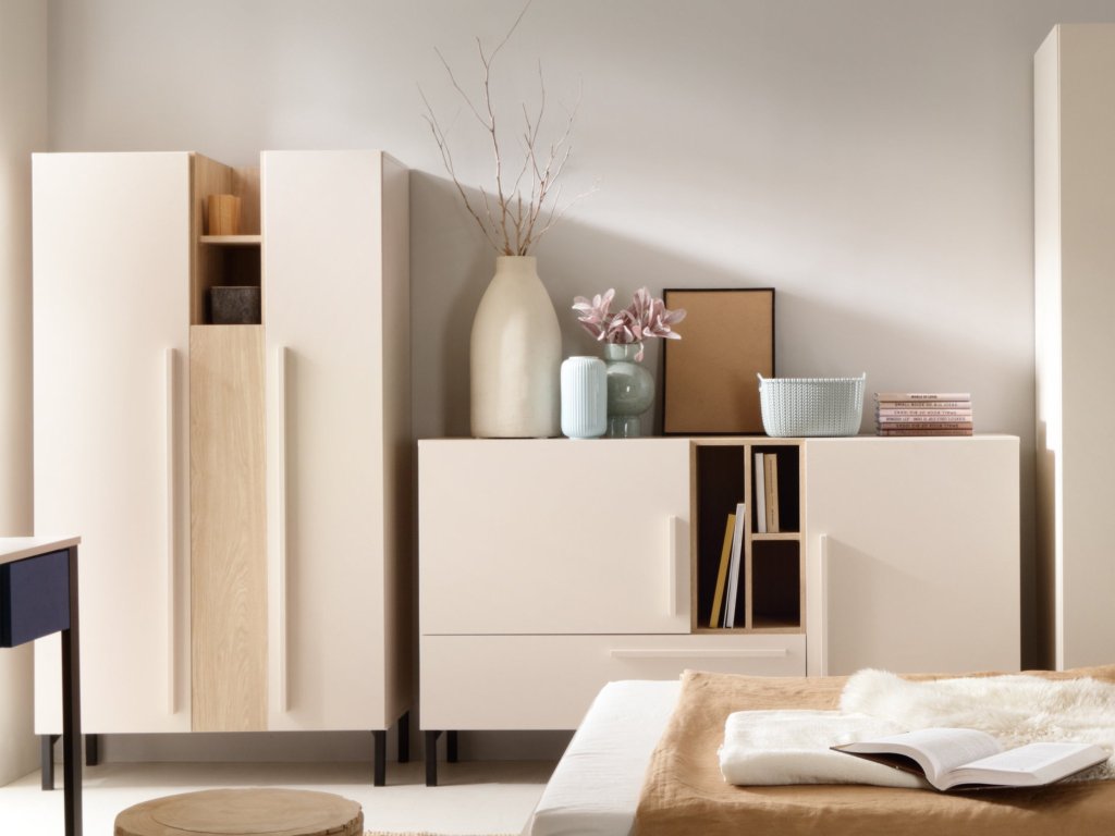 Štýlová dvojdverová komoda do detskej izby SERGIO S6 s vysokými čiernymi nožičkami, zásuvkou, dvomi dvierkami a otvorenými poličkami. Piesková farba na komode je ozvláštnená poličkami v odtieni olejovaný dub. Ak si chcete zariadiť svetlú detskú izbu s použitím prírodných farieb a vzorov, táto komoda sa vám môže hodiť. Zaujímavým detailom sú aj podlhovasté úchytky na otváranie zásuvky a dvierok. Dvojdverová komoda je vyrobená z kvalitnej nábytkárskej laminovanej drevotriesky. Čierne vysoké nožičky sú z kovu. Pre viac úložného priestoru si vyberte ešte jednu šatníkovú skriňu s priestorom na vešanie oblečenia.