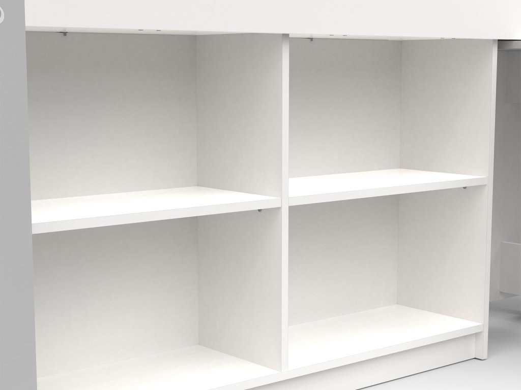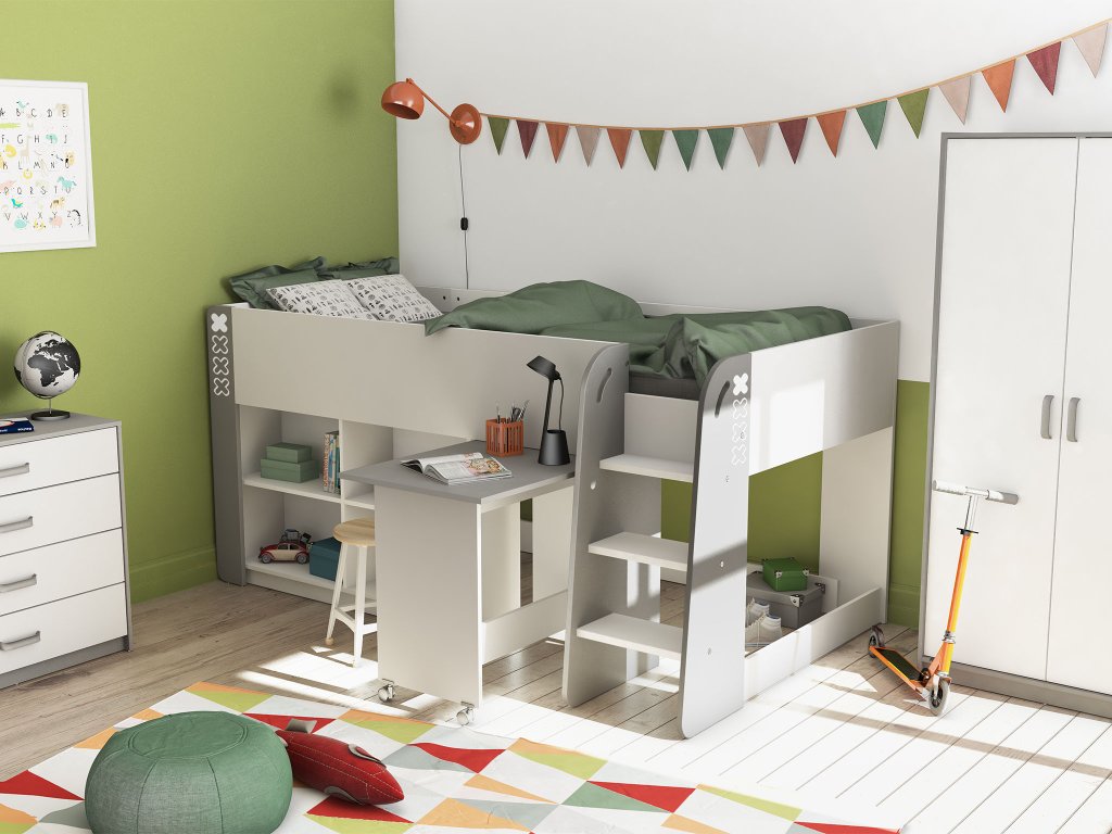 Horné lôžko s rozmerom 90 × 200 cm je ľahko prístupné pomocou trojice bezpečných schodíkov. Pod ním sa ukrýva výsuvný písací stôl na kolieskach, ktorý môžete kedykoľvek vytiahnuť pri učení a zasunúť, keď je čas na hru. Po bokoch nechýbajú otvorené police na knihy, hračky či obľúbené drobnosti. Konštrukcia postele je vyrobená z odolnej 18 mm hrubej drevotriesky s melamínovým povrchom, doplnenej o lakovanú MDF. Tieto materiály zaručujú nielen pevnosť a jednoduchú údržbu, ale aj dlhú životnosť. Zaoblené hrany a konštrukcia navrhnutá podľa bezpečnostnej normy D62-019 sú zárukou bezpečného používania každý deň.
