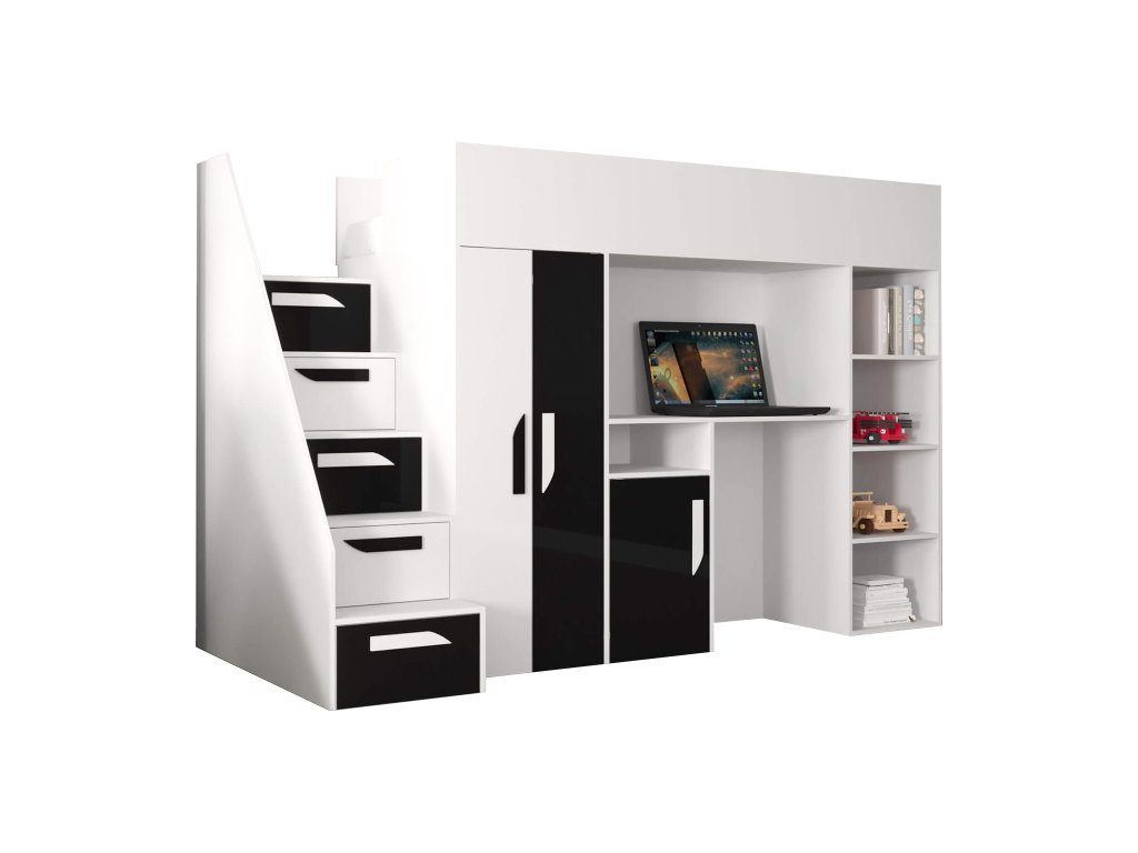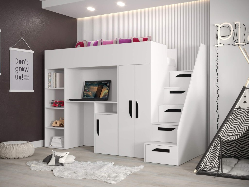 Ak hľadáte spôsob ako vyriešiť málo miesta v detskej izbe, multifunkčná posteľ Party 14 je to správne riešenie. Zakúpením klasickej detskej postele zabezpečíte pre Vaše dieťa len miesto na spanie. Táto posteľ ponúka oveľa viac - lôžko, písací stôl (s dvoma policami), šatníkovú skriňu (s troma policami) a päť šuplíkov. Telo postele je vyrobené z matnej laminovanej dosky o hrúbke 16 mm a čelo z leskej DTD. Okraje sú starostlivo upravené s 0,5 mm PVC dýhou. Posteľ je univerzálna, a tak môže byť postavená ako pravá alebo ako ľavá.