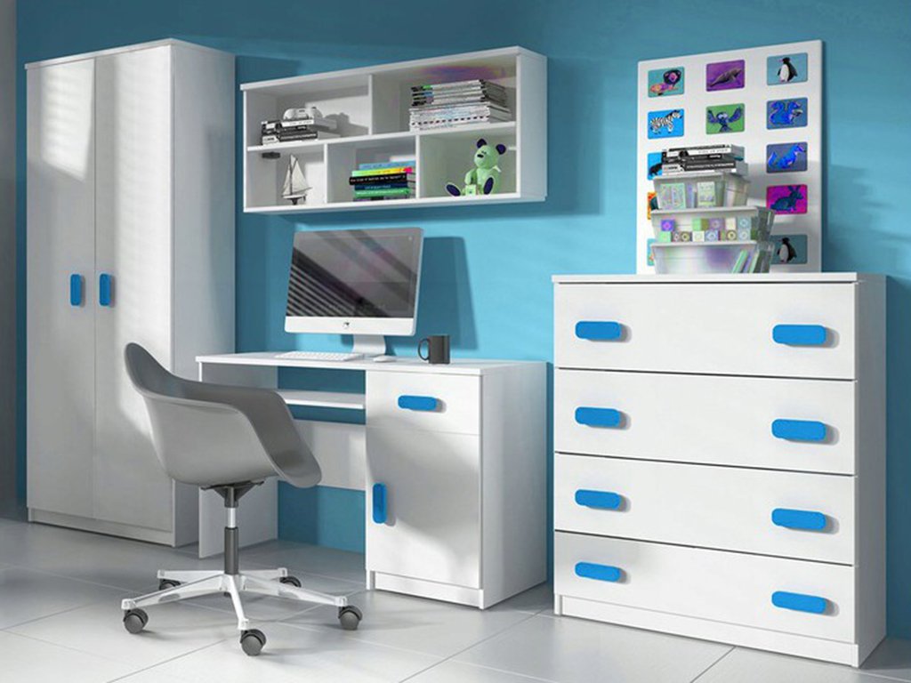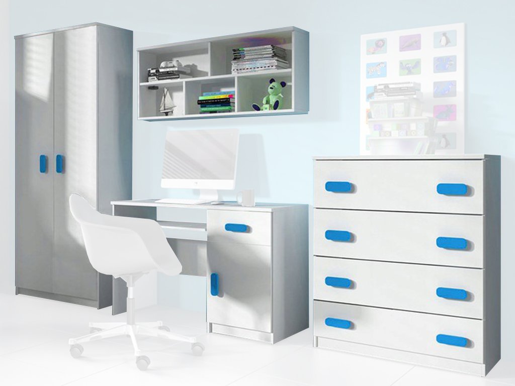 Nadčasový dizajn a štýlovosť sú charakteristickými znakmi tejto krásnej nábytkovej steny. Táto nábytková zostava s úchytmi v modrej farbe je skvelou voľbou do chlapčenskej izbičky. Nábytok z kolekcie SVEND porastie s Vašim dieťaťom.