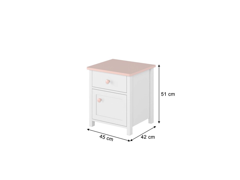 Biely nočný stolík z kolekcie nábytku LUNA navrhnutý do dievčenskej detskej izby. Biely korpus nočného stolíka je doplnený vrchnou doskou a úchytkami v jemnej púdrovo ružovej farbe. Na nočný stolík môžete položiť malú lampičku alebo knižky, ktoré si deti zvyknú čítať pred spaním. Na odkladanie slúži aj menšia zásuvka a skrinka. Stolík je vyrobený z kvalitnej laminovanej dosky (DTD) s odolnými ABS hranami a úchytkami z plastu.