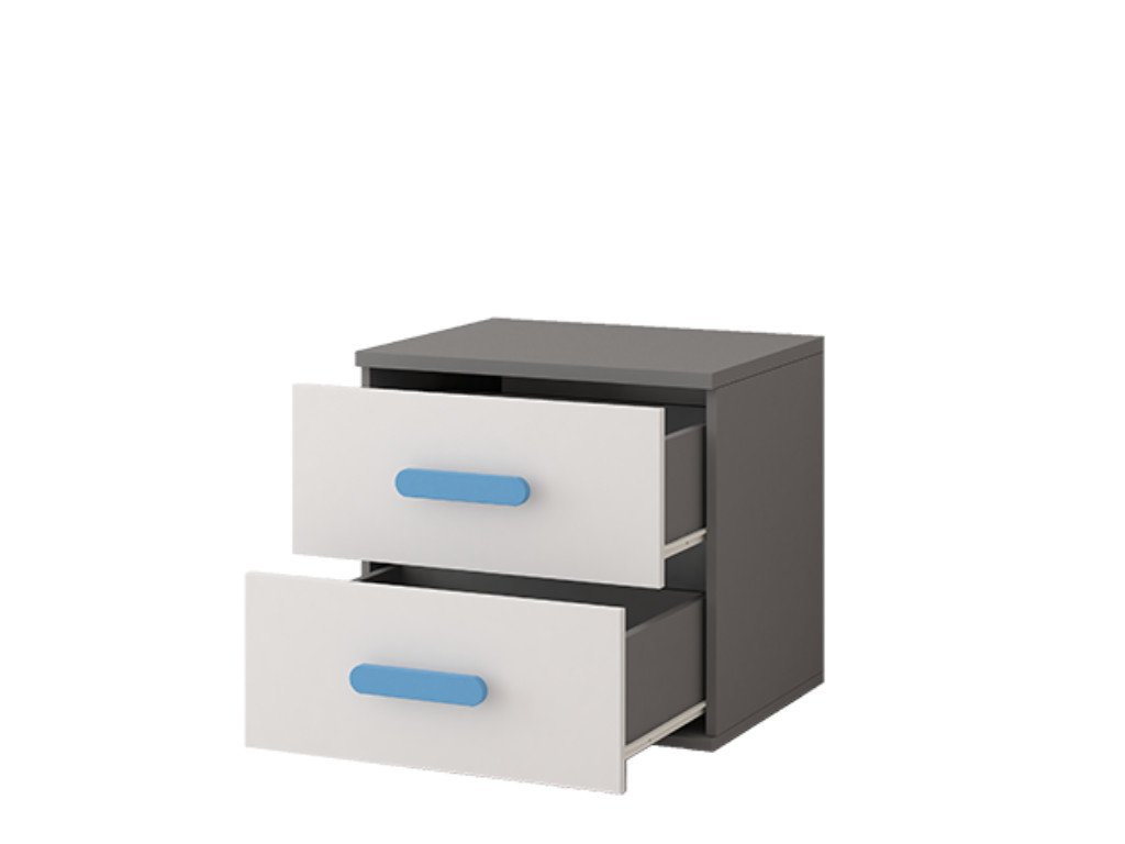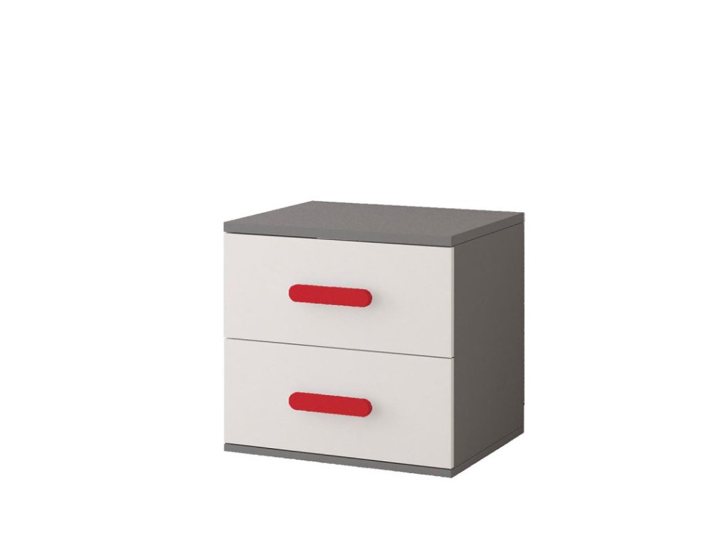 Nočný stolík SVEND je vybavený dvoma zásuvkami. Charakteristickou črtou tejto kolekcie sú farebné úchytky.