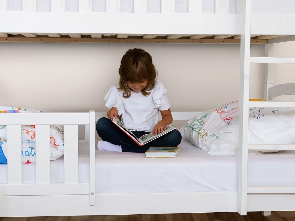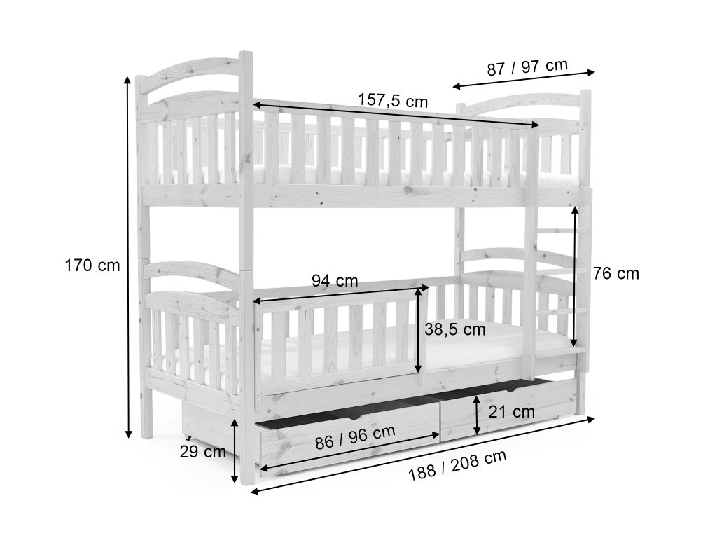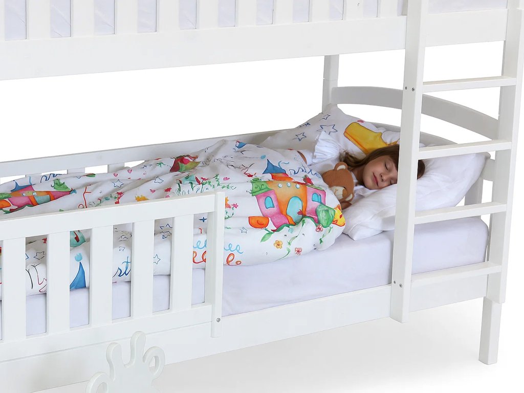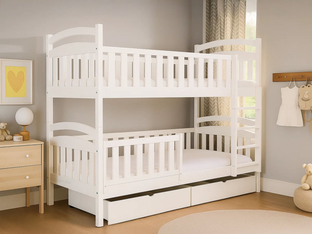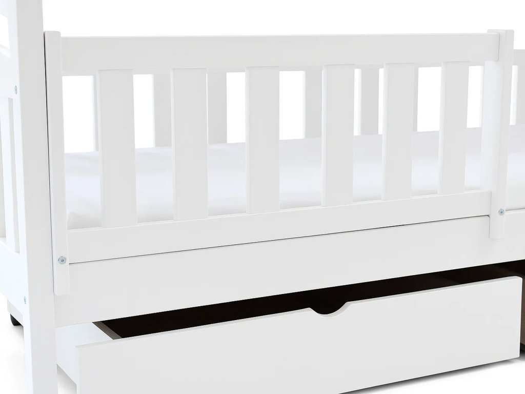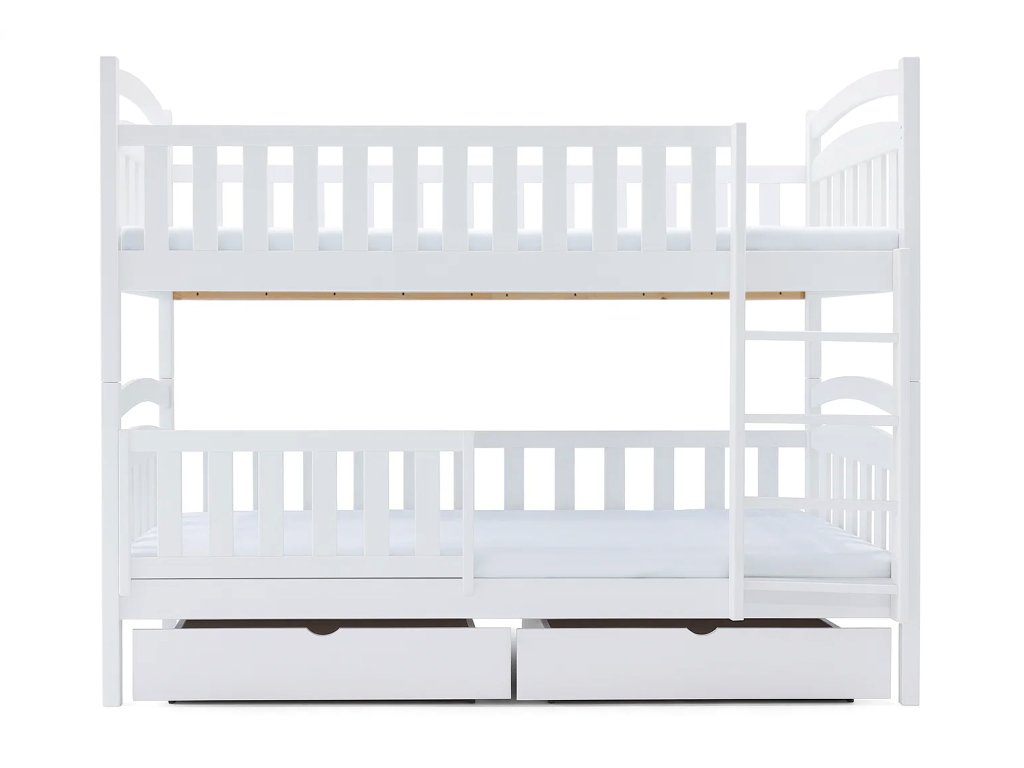 Kvalitná biela poschodová posteľ Paula 7 z masívneho borovicového dreva s bariérkou a dvoma úložnými priestormi. Posteľ sa vyznačuje veľmi stabilnou konštrukciu a zaoblenými hranami postele, ktoré chránia Vaše deti pred úrazom. Je lakovaná ekologicky nezávadným lakom. Posteľ je s 2 úložnými priestormi, ktoré sú na kolieskach, aby Vám nepoškodili podlahu. Nie sú upevnené, čiže je s nimi veľmi ľahká manipulácia. Posteľ je rozložiteľná na dve samostatné lôžka. Spoj postelí je riešený kolíkmi, a tak môžete posteľ veľmi rýchlo a jednoducho zložiť alebo rozložiť. Rebrík k posteli je obojstranný, čo znamená, že posteľ môžete namontovať s rebríkom na pravej alebo ľavej strane. Rebrík sa vyznačuje širokou skosenou nástupnou plochou, a tak dieťaťu zabezpečuje pohodlné vyliezanie a zliezanie z postele. Poschodové postele vám ušetria veľa miesta v izbe, ktoré môžu vaše deti využiť na hranie. Bariéra na spodnú časť postele je v cene.