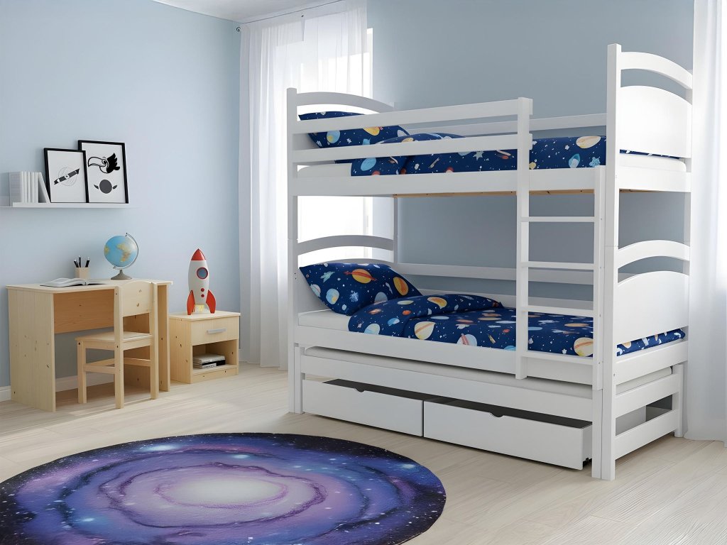 Veľká poschodová posteľ s prístelkou Vám pomôže ušetriť miesto v detskej izbe, nakoľko získate až tri lôžka na spanie.