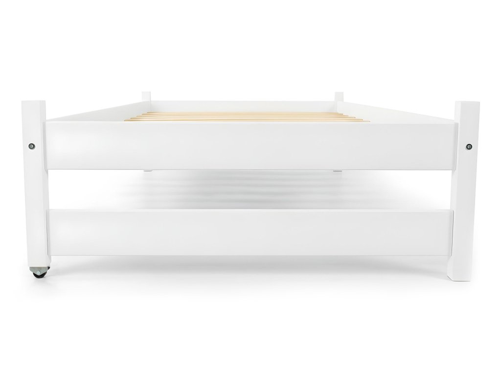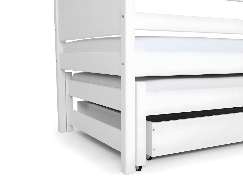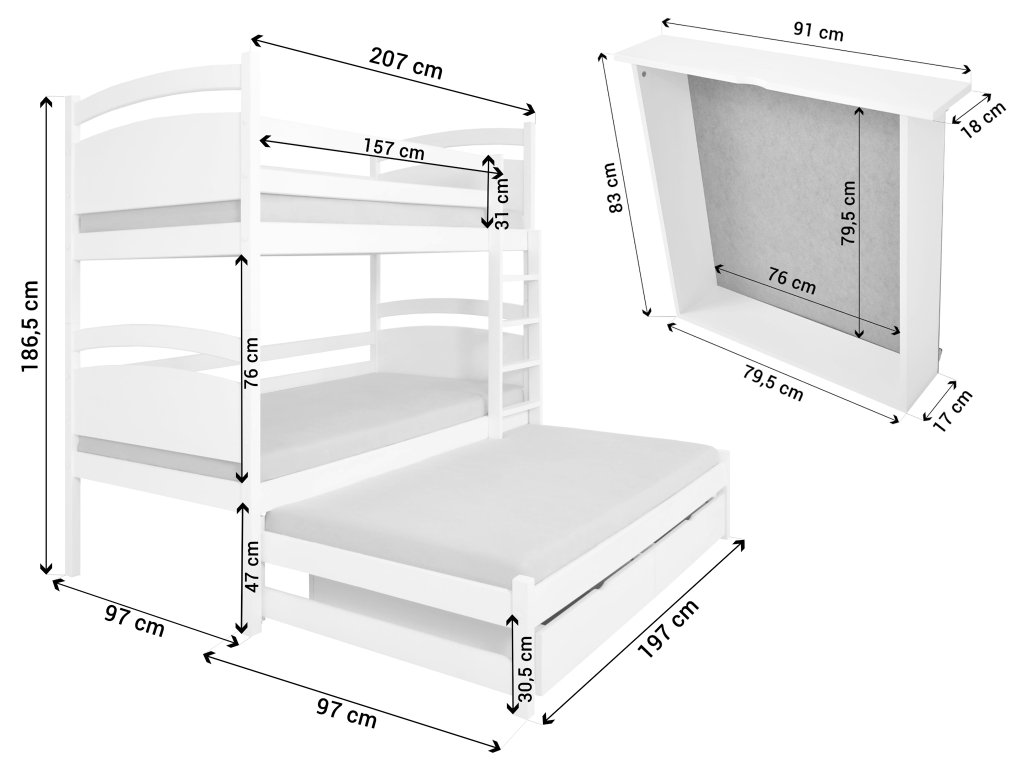 Poschodová posteľ s výsuvnou prístelkou (200x90 cm) je vyrobená z masívu borovice a má pevnú konštrukciu. Trojlôžko je vysoko kvalitné a stabilné. Poschodová posteľ je 3x lakovaná ekologickým lakom. Rebrík na posteli je obojstranný, je možné ho namontovať na pravú alebo na ľavú stranu. Posteľ je možné rozložiť na 2 samostatné lôžka. Poschodová posteľ s prístelkou je s 2 úložnými priestormi, ktoré sú na umelých kolieskach, aby Vám nepoškodili podlahu. Nie sú upevnené, čiže je s nimi veľmi ľahká manipulácia. Prístelka je vysúvateľná a spraví Vám na dvojposchodovej posteli tretie plnohodnotné lôžko. Umelé kolieska sú len na zadných nohách prístelky, čo umožňuje ľahkú manipuláciu, t.j. jej vysúvanie a zasúvanie. K detskej posteli si môžete dokúpiť aj bariérku na spodné lôžko v rovnakej farbe ako posteľ. Zábrana chráni dieťa pred pádom z postele počas spánku. Úložné priestory nevypĺňajú celý priestor pod posteľou. Medzi nohami postele a úložnými boxami je väčšia medzera ako je znázornené na fotografii.