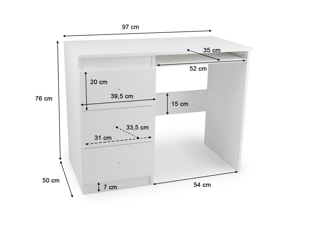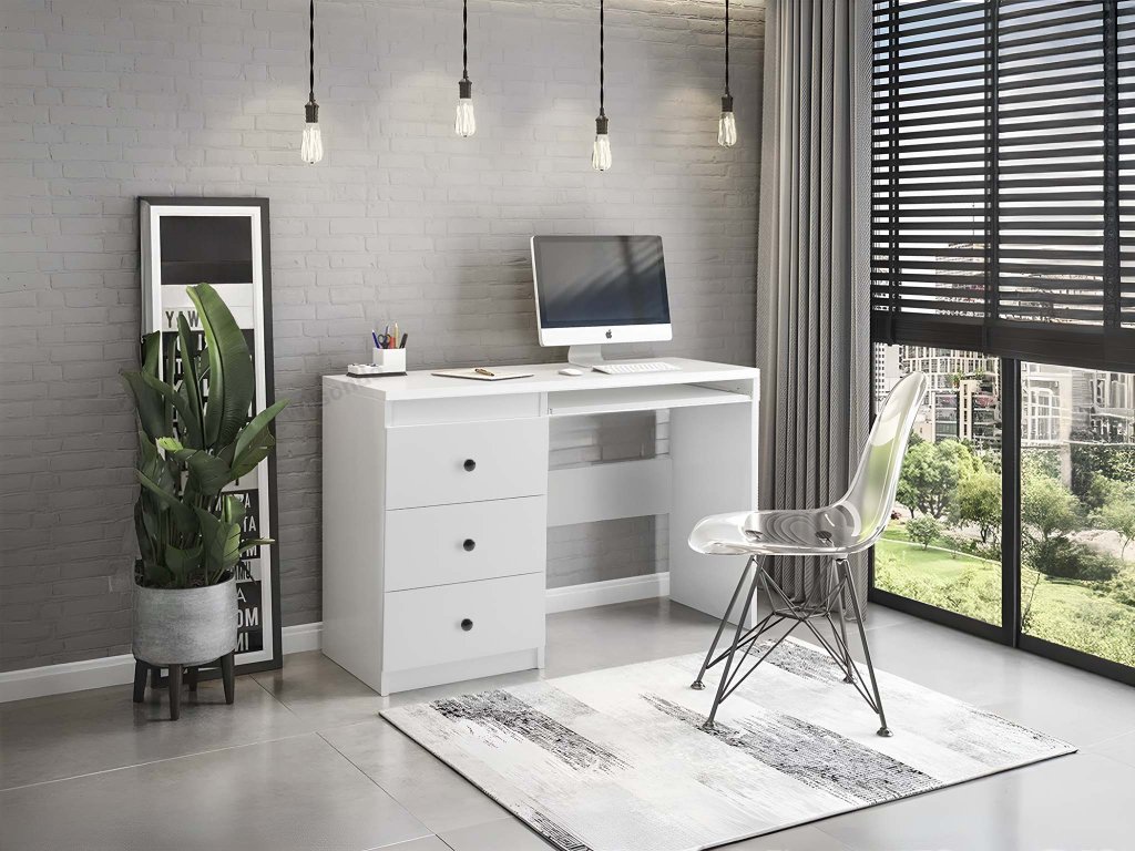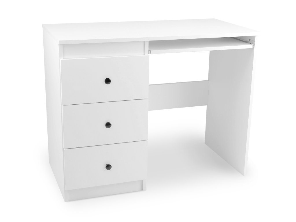 Biely písací stôl Leo L1 je ideálnym doplnkom do akéhokoľvek interiéru. Tento univerzálny stôl s elegantnými čiernymi úchytkami, poskytuje dostatok priestoru na prácu a organizáciu. Vďaka svojej pevnej konštrukcii zvládne aj najnáročnejšie pracovné dni. Vyrobený z bielej drevotrieskovej dosky KRONO s čiernymi úchytkami, stôl Leo L1 spája eleganciu a odolnosť. Biela PVC páska HRANIPEX dodáva stolu dokonalý finálny vzhľad. Tri zásuvky a jedna výsuvná písacia doska vám pomôžu udržať poriadok. Výsuvná doska môže slúžiť ako úložný priestor alebo miesto na klávesnicu. Písací stôl Leo L1 je praktický a vhodný na štúdium aj prácu.