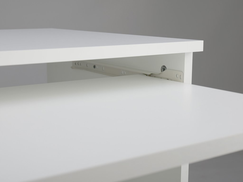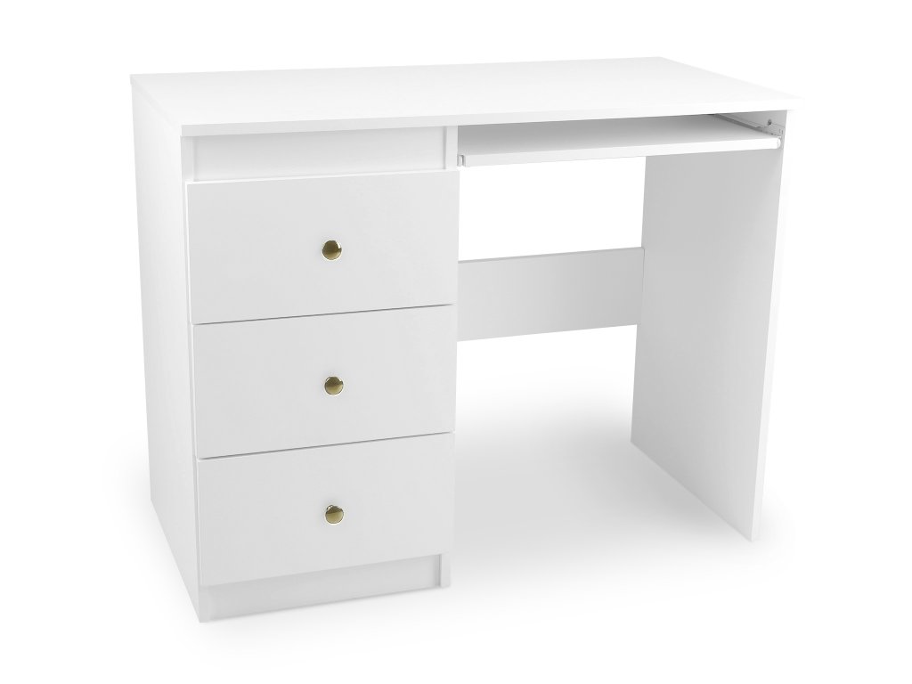 Doprajte vašej kancelárií alebo domácnosti nádych klasickej elegancie s naším písacím stolom Leo L1. Jeho minimalistický dizajn zapadne do každého interiéru. Zlaté úchytky na bielom písacom stole pôsobia veľmi elegantne a štýlovo. Priestranná pracovná doska ponúka miesto na kreatívne tvorenie. Je vyrobený z bielej drevotrieskovej dosky KRONO, ktorá je odolná a pevná. Hrany majú bielu PVC pásku HRANIPEX, čo dodáva stolu dokonalý finálny vzhľad. Poriadok vám pomôžu udržať tri zásuvky a jedna výsuvná písacia doska. Výsuvná doska môže poslúžiť ako úložný priestor ale aj na vysúvanie klávesnice.