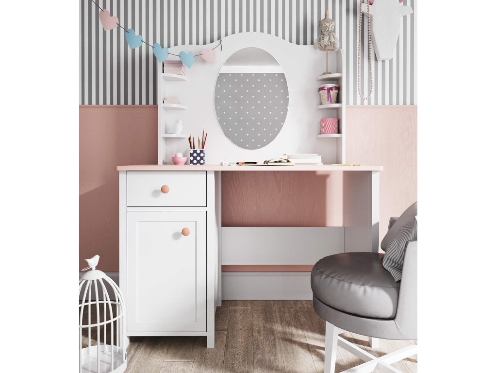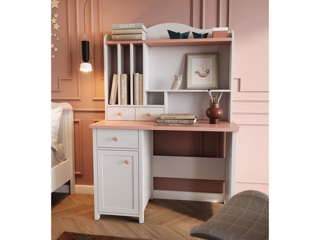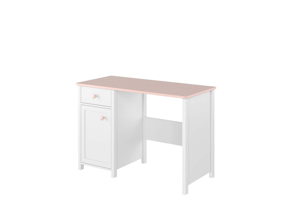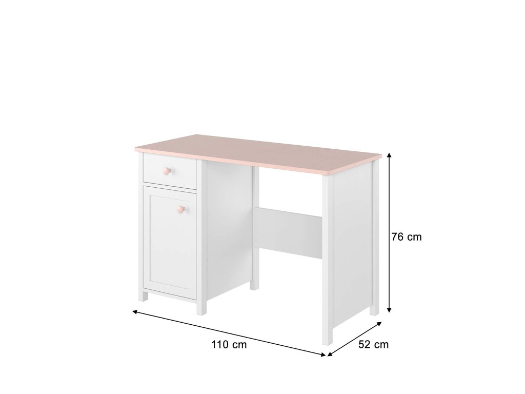 Biely písací stôl LUNA pre deti s priestrannou vrchnou doskou v púdrovo ružovej farbe, so zásuvkou a skrinkou na knihy, zošity alebo omaľovánky. Deti môžu stôl v detskej izbe využiť na kreslenie, písanie domácich úloh a neskôr aj ako PC stolík. Ak by ste chceli dobre využiť aj priestor nad stolíkom, je to možné vďaka dvom nadstavcom z kolekcie LUNA, ktoré môžete k stolíku doplniť. Jeden nadstavec je v štýle toaletky so zrkadlom a druhý je ideálny na pracovný stôl s niekoľkými poličkami a zásuvkami. Písací stôl je vyrobený z kvalitnej laminovanej dosky (DTD) s odolnou ABS hranou.
