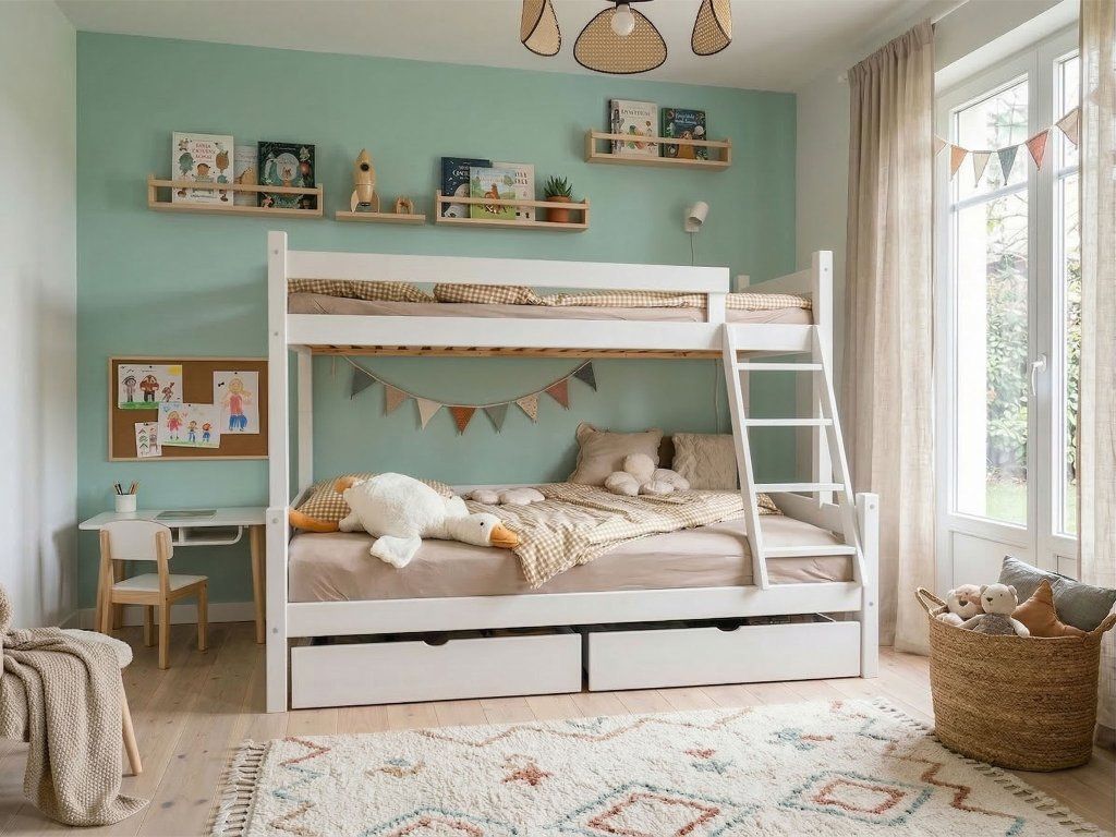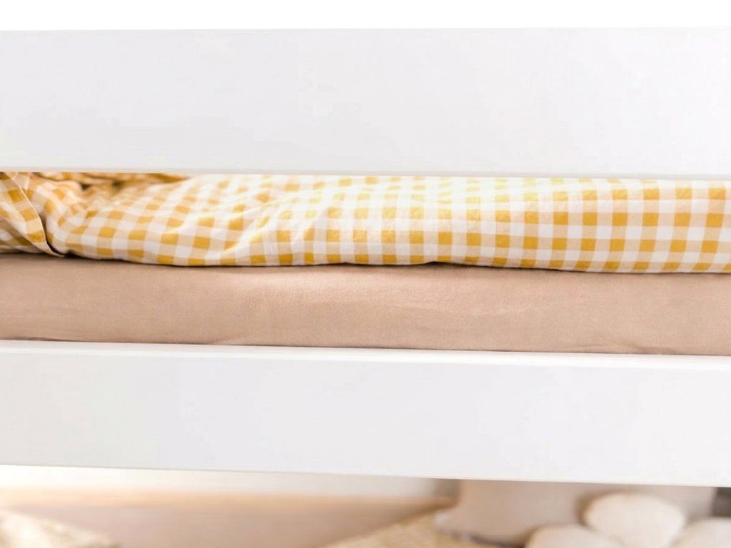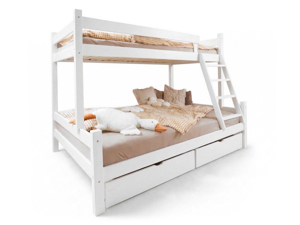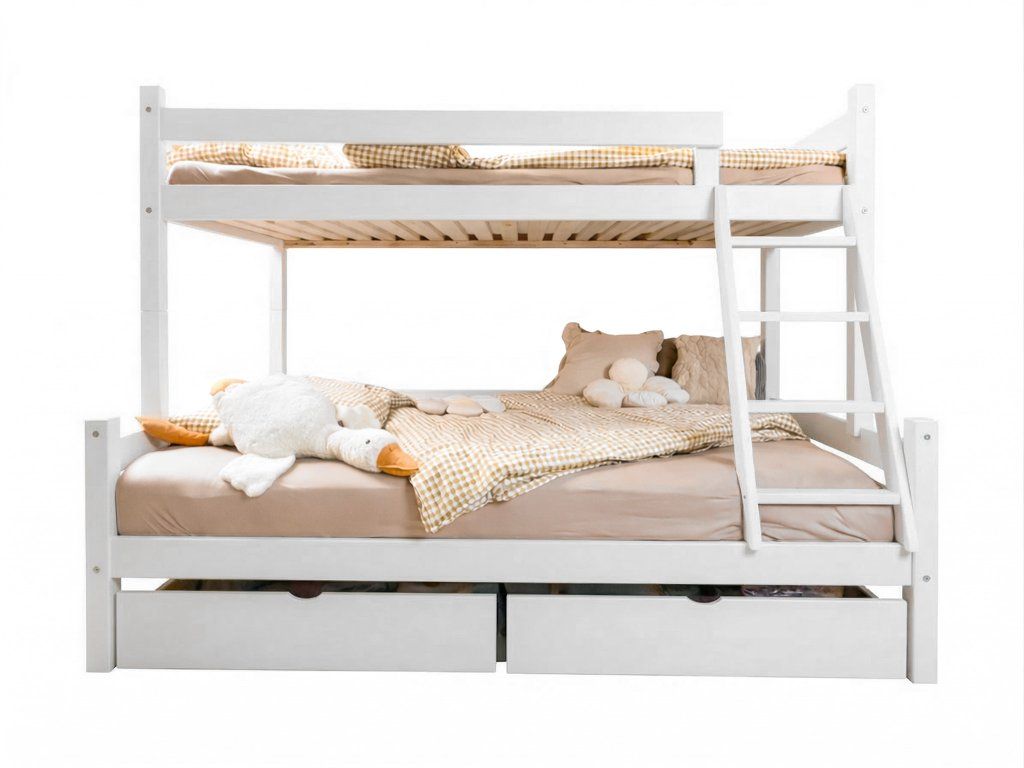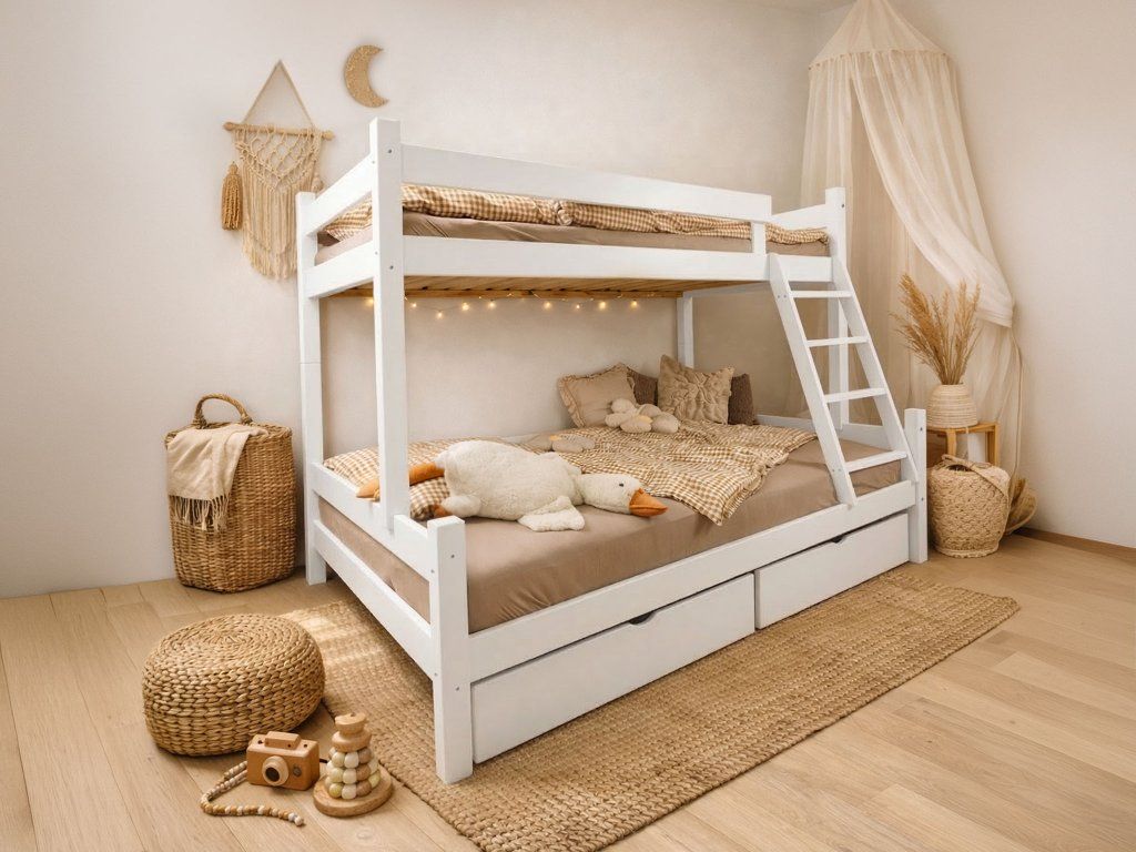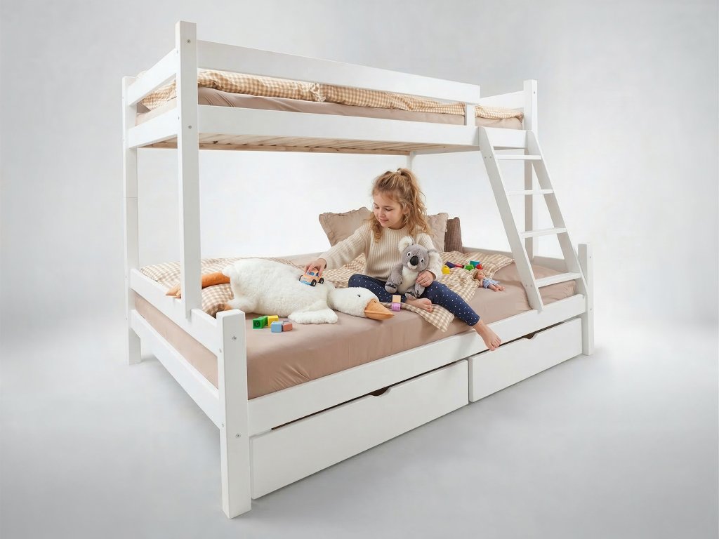 Poschodová posteľ s rozšíreným spodným lôžkom (200x120 cm) je vyrobená z borovicového masívu a má pevnú konštrukciu. Posteľ je vďaka použitým materiálom veľmi kvalitná, stabilná a odolná. Poschodová posteľ je dostupná v bielej farbe, 3x lakovaná ekologickým lakom. Poschodová posteľ je dodávaná s 2 úložnými priestormi, ktoré sú na kolieskach, aby Vám nepoškodili podlahu. Nie sú upevnené, čiže je s nimi veľmi ľahká manipulácia. Rebrík na poschodovej posteli je obojstranný, tzn. posteľ je možné namontovať s rebríkom na pravej aj ľavej strane. Úložné priestory nevypĺňajú celý priestor pod posteľou. Medzi nohami postele a úložnými boxami je väčšia medzera ako je znázornené na fotografii.