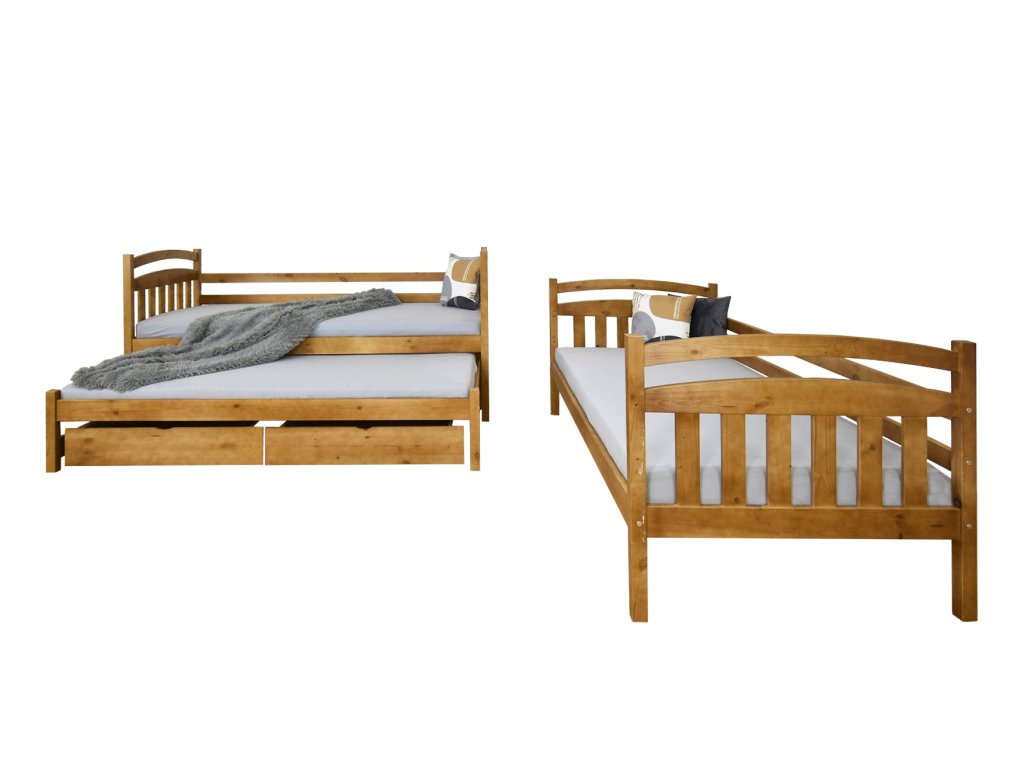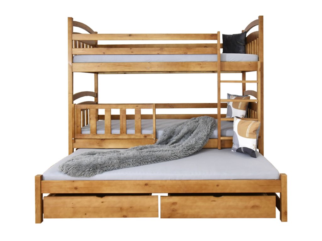 Poschodová posteľ Petra 1 vo farbe dubu je vyrobená z masívu borovice a má pevnú konštrukciu. Trojlôžko je vysoko kvalitné a stabilné. Poschodová posteľ je 3x lakovaná ekologickým lakom. Posteľ je možné rozložiť na 2 samostatné lôžka. Rebrík je obojstranný, to znamená posteľ je možné zmontovať s rebríkom na pravej alebo ľavej strane. Rošty sú tiež vyrobené z pevného dreveného masívu. Poschodová posteľ s prístelkou je s 2 úložnými priestormi, ktoré sú na umelých kolieskach, aby Vám nepoškodili podlahu. Nie sú upevnené, čiže je s nimi veľmi ľahká manipulácia. Prístelka je vysúvateľná a spraví Vám na dvojposchodovej posteli tretie plnohodnotné lôžko. Umelé kolieska sú len na zadných nohách prístelky, čo umožňuje ľahkú manipuláciu, t.j. jej vysúvanie a zasúvanie. Na spodnom lôžku je bariérka, ktorá je súčasťou postele a chráni dieťatko pred vypadnutím z postele.Úložné priestory nevypĺňajú celý priestor pod posteľou. Medzi nohami postele a úložnými boxami je väčšia medzera ako je znázornené na fotografii.