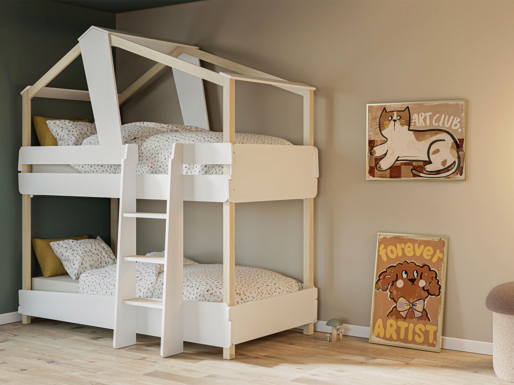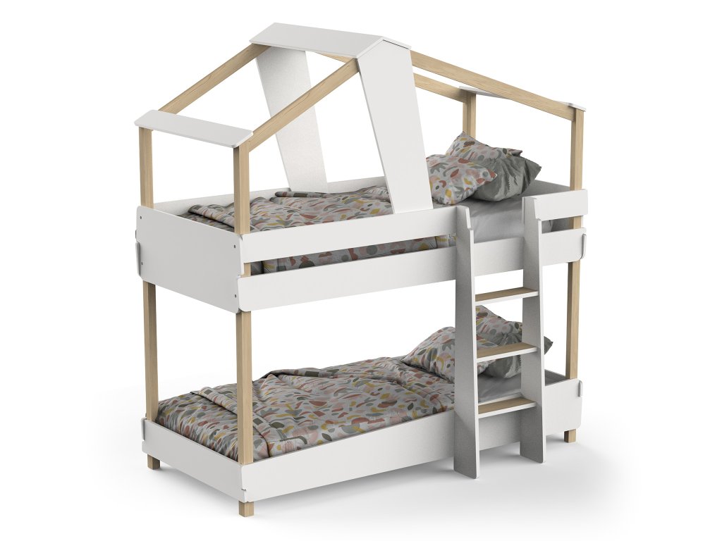 Poschodová posteľ Timber vnesie do detskej izby kúzlo rozprávkovej atmosféry, plnej hier, fantázie a nezabudnuteľných dobrodružstiev. Vďaka dizajnu v tvare domčeka sa izba premení na útulný priestor, kde sa deti budú cítiť pohodlne a bezpečne, či už pri spánku, hrách alebo čítaní obľúbených kníh. Táto praktická posteľ je skvelou voľbou pre súrodencov alebo na úsporu miesta v izbe. Je vybavená stabilným rebríkom, ktorý zaručuje jednoduchý a bezpečný prístup na horné lôžko. Stabilná konštrukcia je vyrobená z masívneho borovicového dreva v kombinácii s kvalitnou drevovláknitou doskou MDF, čo zaručuje jej odolnosť a dlhú životnosť. Povrch postele je ošetrený netoxickou farbou na vodnej báze, takže prispieva k zdravému ovzdušiu v miestnosti a je úplne bezpečný pre deti. Kombinácia elegantnej bielej farby s prírodným odtieňom dreva pôsobí jemne. Detská posteľ Timber sa stane krásnym doplnkom detskej izby, bez ohľadu na to, či je zariadená pre dievča alebo chlapca.