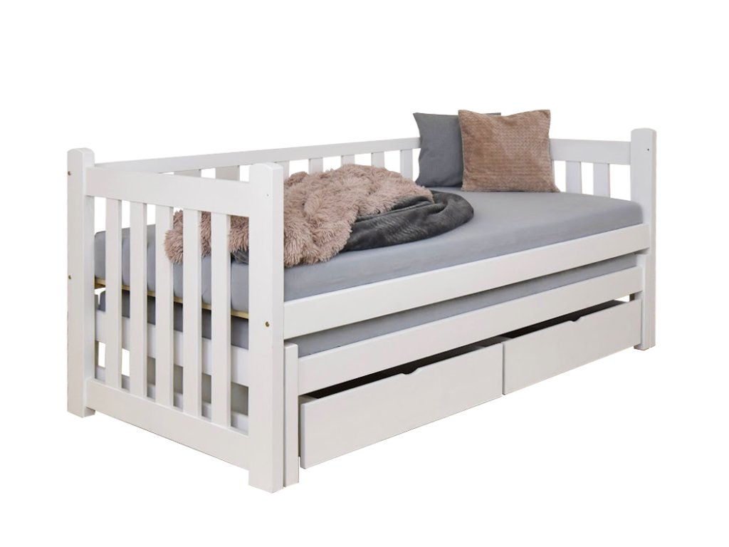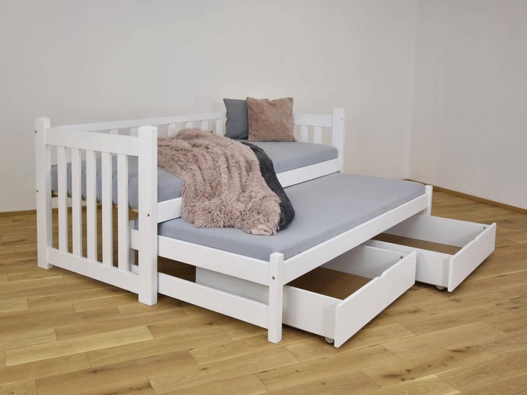 Detská posteľ Veronika 2 s rozmerom 200x90 cm s výsuvnou prístelkou vyrobená z pevného masívu borovice. Táto posteľ je vhodná do detskej izby, ale vďaka vysokej nosnosti postele, je vhodná aj pre dospelú osobu. Ušetríte v izbe viac priestoru na hry a zábavu. Posteľ je dostupná v dvoch farebných prevedeniach (biela – prírodná). Trikrát lakovaná bezfarebným, ekologicky nezávadným lakom. Posteľ je možné rozložiť na 2 samostatné lôžka. Posteľ Veronika je s 2 úložnými priestormi, ktoré sú na plastových kolieskach, aby Vám nepoškodili podlahu. Nie sú upevnené, čiže je s nimi veľmi ľahká manipulácia. Možnosť dokúpenia bariérky vo farbe postele. Bariéra je odnímateľná, a tak ju môžete kedykoľvek odmontovať.