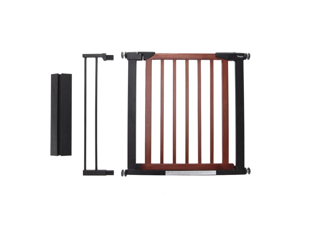 Kovový rám v tvare písmená "U" je možné namontovať bez vŕtania, jednoduchým rozoprením. Zábrana je určená pre otvory od 75 cm do 82 cm, a však súčasťou balenia je aj rozšírenie, ktoré Vám umožní zábranu umiestniť do otvoru až do 96 cm. K záberane je pribalená rampa, ktorá uľahčí priechod cez zábranu. Kombinácia kovovej konštrukcie a čerešňového dreva premieňa zábranu na dizajnový kúsok, ktorý sa oplatí mať doma.