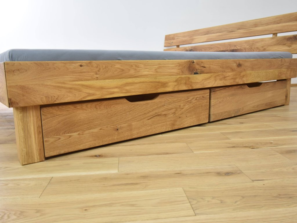Praktická sada 2 úložných boxov k posteli ALEA je vyrobená zo 100% dubového dreva s hrúbkou dosiek 2,4 cm a chránená ekologickým olejom, ktorý ju chráni pred vlhkosťou a nečistotami. Podobne ako posteľ sú ponúkané v prírodnej farbe dubového dreva, ktorá pôsobí teplým a príjemným vzhľadom.