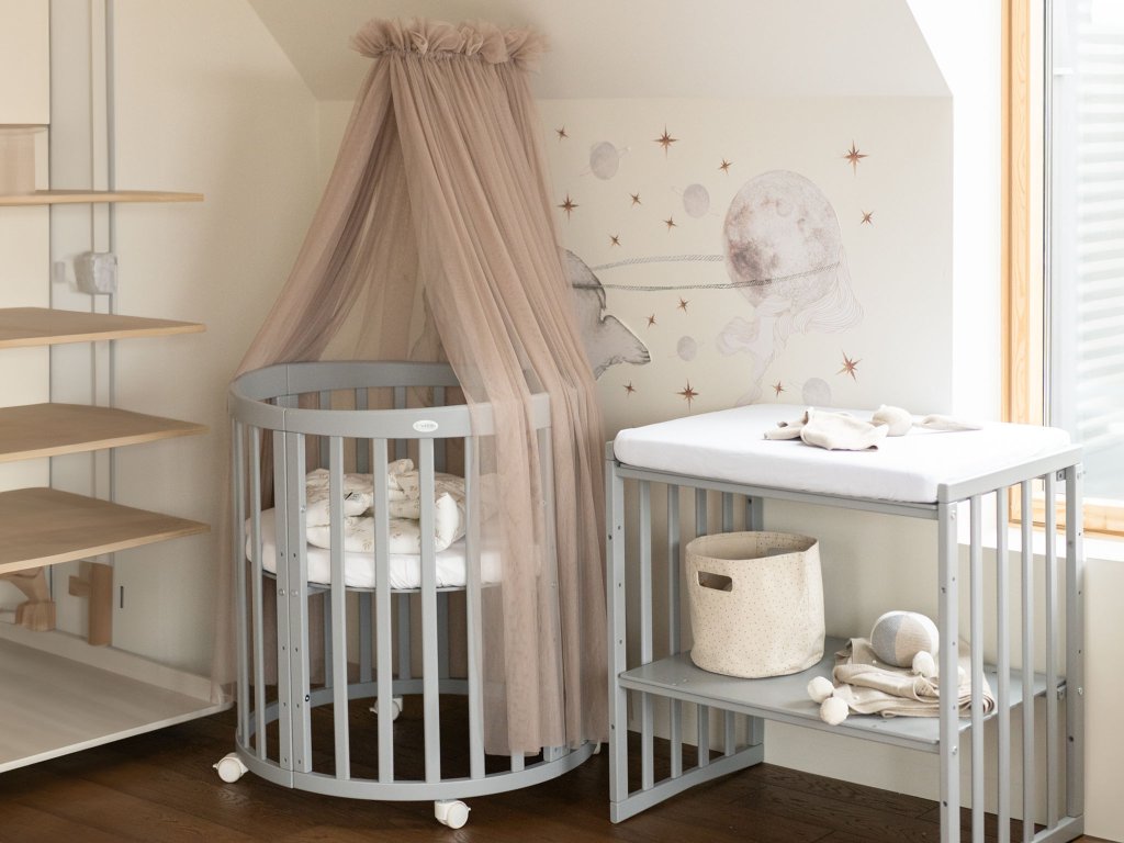 Sivá detská rastúca postieľka 7v1, ktorá sa stane praktickým spoločníkom počas rastu vášho dieťaťa. Umožňuje viacero využití – od prístelky pre novorodenca, cez oválnu postieľku a ohrádku až po detský nábytok, ako sú kresielka so stolíkom. Vyrobená z odolného bukového dreva s ekologickým náterom bezpečným pre deti. Rošt je možné nastaviť do 5 výškových polôh (7–49 cm, s kolieskami 55 cm). Súčasťou balenia je trojdielny matrac z peny T25 s bavlneným poťahom, ktorý sa dá jednoducho prať.